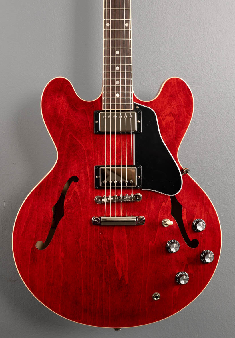 "The Gibson ES-335 DOT is the cornerstone of the Gibson ES line-up. From its inaugural appearance in 1958, the Gibson ES-335 set an unmatched standard. The pearloid dot inlay rosewood fingerboard on a hand-rolled Rounded "C" mahogany neck remind players where it all started. Gibson's Calibrated T-Type humbucking pickups are paired with our hand-wired control assembly. The result is that versatile Gibson ES tone that players have craved for over 60 years. Tuning stability and precise intonation are provided by the Vintage Deluxe tuners with Keystone buttons, paired with light weight Aluminum ABR-1 bridge and Stop Bar tailpiece, anchored by steel thumb-wheels and tailpiece studs."