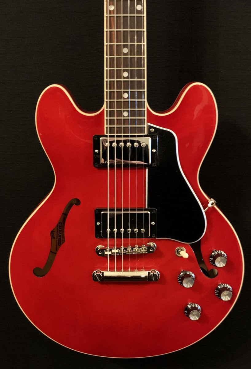 "The Gibson ES-339 is a modern classic designed for those seeking the tone and look of an ES-335, but desire a slightly smaller, lighter instrument. The pearloid dot inlay rosewood fingerboard on a hand-rolled Rounded "C" mahogany neck remind players where it all started. The 57 / 57 Classic + humbuckers paired with our hand-wired tone circuit showcases the versatile Gibson ES tone that players have craved for over 60 years. Tuning stability and precise intonation are provided by the Grover Rotomatic tuners with Kidney buttons paired with light-weight Aluminum ABR-1 bridge and Stop bar tailpiece. Impressive gloss finishes include Cherry, and Transparent Ebony."