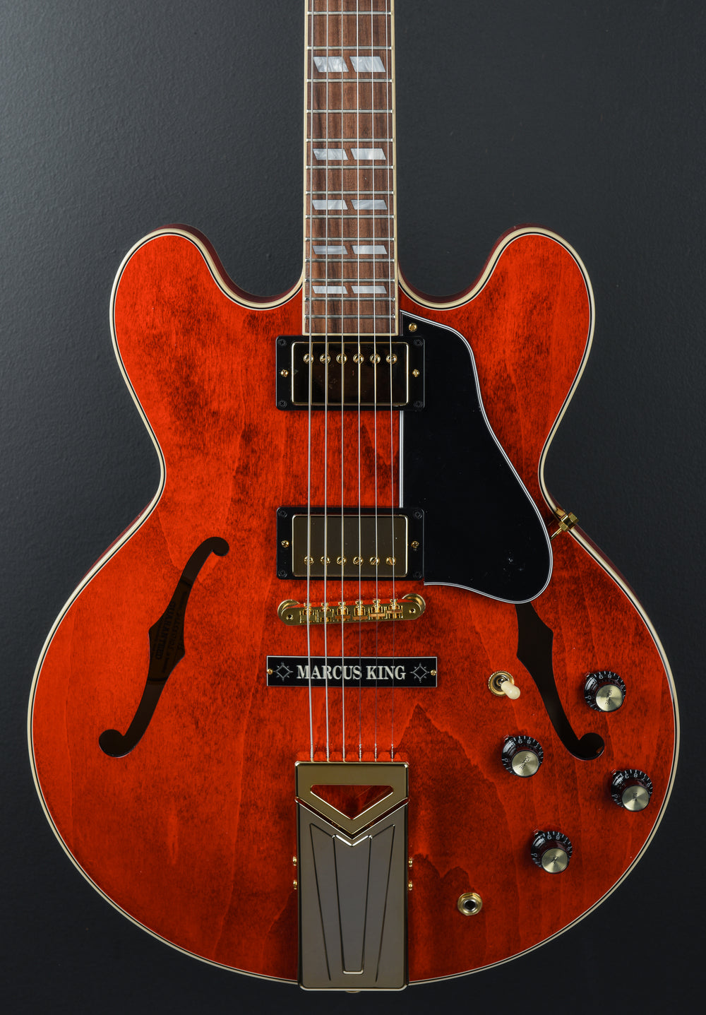 "Marcus King is a singer, songwriter, and guitarist with the soul of American roots music flowing through his DNA. Hailing from South Carolina, his spine-tingling vocals and emotive guitar playing were influenced from an early age by his blues guitarist father, Marvin King, and his grandfather, a country musician. Now, before reaching the age of 30, Marcus is partnering with Gibson on a second remarkable signature model, based on the instrument that was handed down from his grandfather to his father, and finally to him as he took his family's musical legacy to stages worldwide. Originally released as a Custom Shop model, the new Marcus King ES-345 is inspired by his main guitar, a 1962 ES-345 that was handed down to him by his family. This modern version captures the look and vibe of his original, with only the features that Marcus finds essential, including mono wiring, a pair of Custombucker humbucker™ pickups, a fixed Vibrola™ tailpiece for improved tuning stability, and a stud anchor cover customized specifically for Marcus King. All of the standard ES-345 features that you’d expect are also present, including the 3-ply maple/poplar/maple body, solid maple center block for improved sustain and feedback resistance, and gold hardware, including an ABR-1 Tune-O-Matic™ bridge and Grover® Rotomatic® tuners with kidney buttons. The mahogany neck features a Rounded profile that averages .875” at the first fret and .975” at the 12th fret. The Indian rosewood fretboard is adorned with acrylic split parallelogram inlays and equipped with 22 medium jumbo frets. A Graph Tech® nut adds to the tuning stability, and the guitar is finished in classic Sixties Cherry. A Gibson hardshell case is included to keep the Marcus King ES-345 safe when it is stored or in transport."