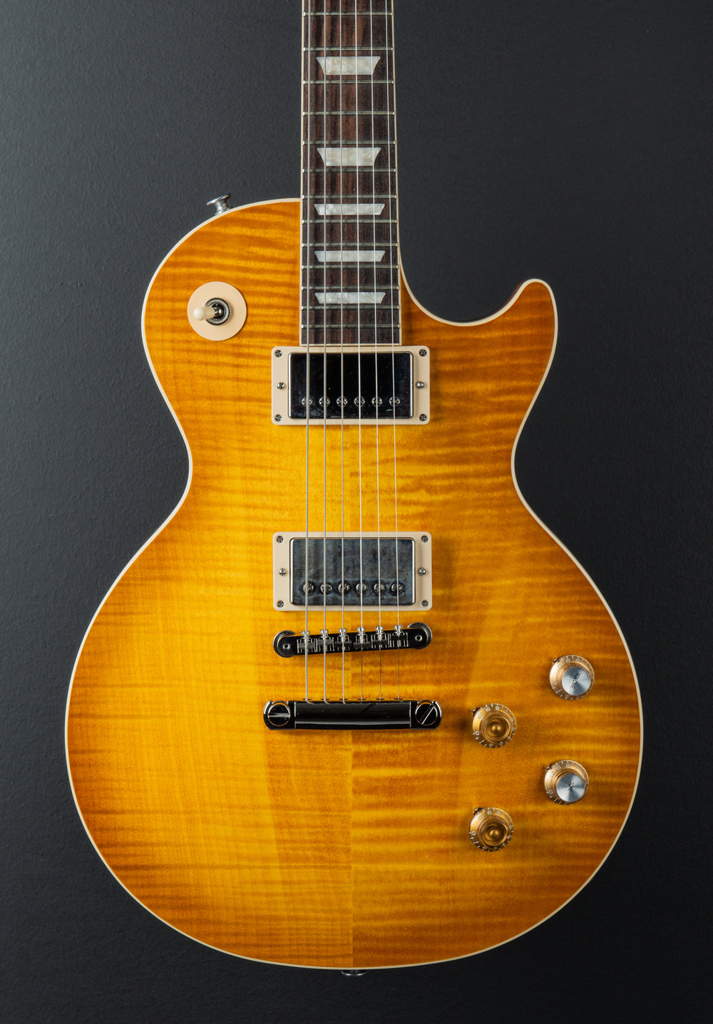 Greeny Burst, Satin nitrocellulose lacquer finish, AAA figured Maple top on a Mahogany body, 50's vintage shaped Mahogany neck, Bound 12” radius Indian Rosewood fingerboard with the acrylic trapezoid inlays and medium jumbo frets, 24.75” scale length, 1.695″ nut width, Greenybucker bridge and reverse mounted Greenybucker with reversed magnetic polarity neck pickups, 3-way toggle switching with the volume and tone controls for each pickup, ABR-1 tune-o-matic bridge and aluminum stopbar tailpiece, Grover Rotomatic tuners with the contemporary buttons, 9.0 pounds, With hardshell case