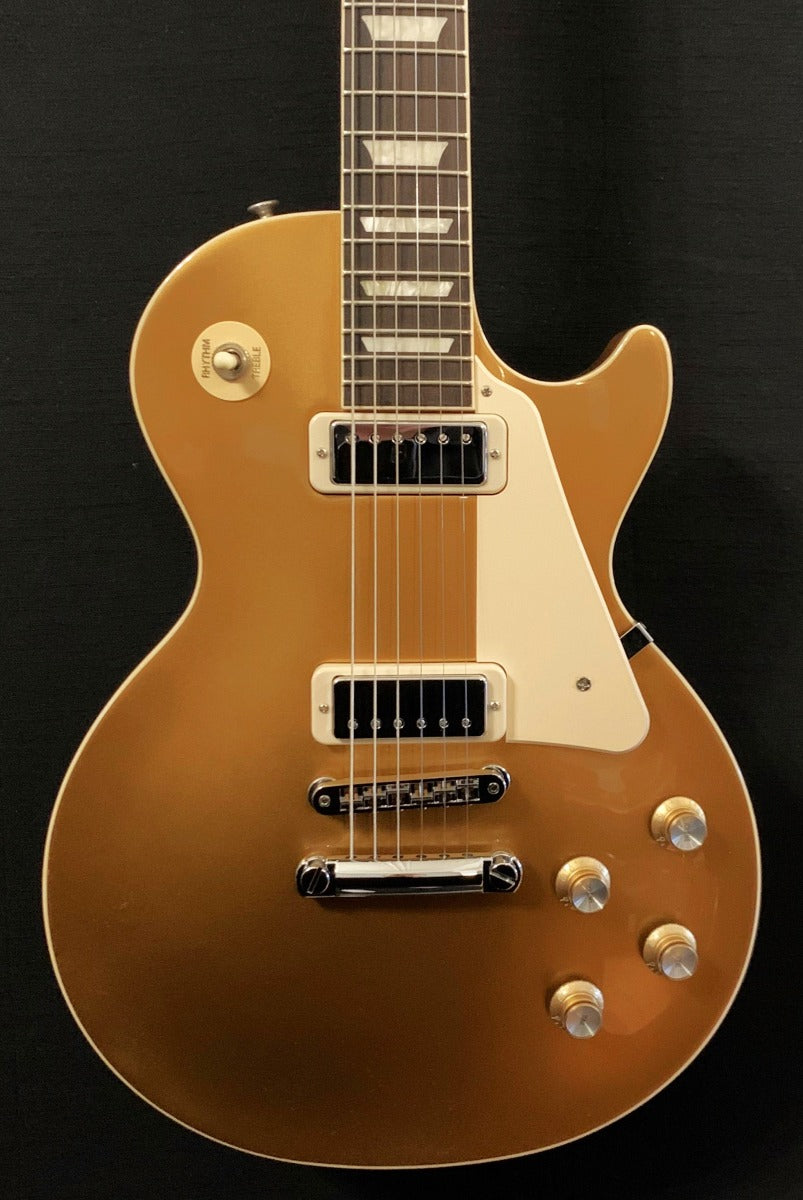 Gold Top, Gloss nitrocellulose lacquer finish, Maple top on a solid Mahogany body, Rounded C shaped Mahogany neck, Bound 12” radius Indian Rosewood fingerboard with the acrylic trapezoid inlays and medium jumbo frets, 24.75” scale length, 1.7″ nut width, Mini humbucking bridge and neck pickups, 3-way toggle switching with the volume and tone controls for each pickup, Tune-o-matic bridge and aluminum stopbar tailpiece, Gibson deluxe tuners, 9.2 pounds, With hardshell case