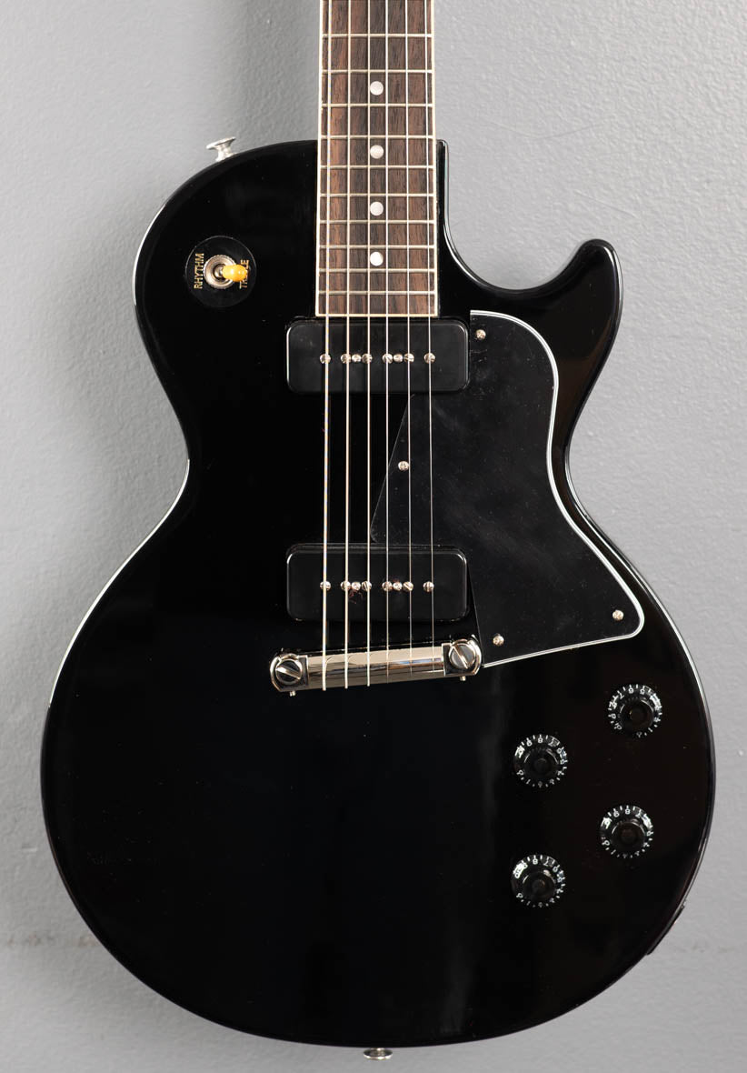 Ebony, Gloss nitrocellulose lacquer finish, Mahogany body, Vintage 50’s shaped Mahogany neck, Bound 12” radius Rosewood fingerboard with the acrylic dot inlays and medium jumbo frets, 24.75” scale length, 1.69" nut width, P-90 bridge and neck pickups, 3-way toggle switching with the volume and tone controls for each pickup, Wraparound tailpiece, Gibson vintage deluxe tuners, 7.8 pounds, With hardshell case