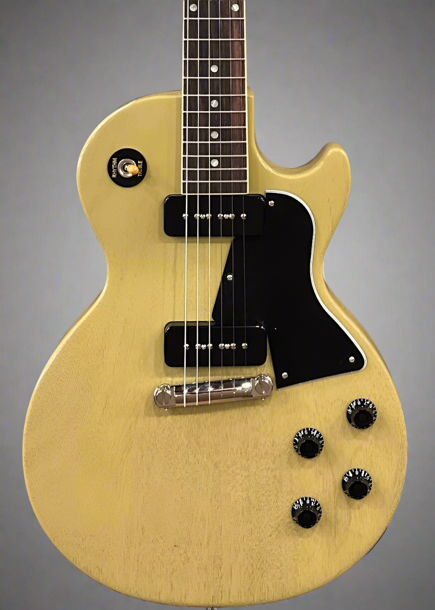 “The Les Paul Special returns to the classic design that made it relevant, played and loved shaping sound across generations and genres of music. It pays tribute to Gibson's Golden Era of innovation and brings authenticity back to life. Originally introduced in 1955, the Les Paul Special has been embraced by musicians for over 60 years. It is based on the Les Paul Junior with a slab mahogany body, fat 50s-style mahogany neck, rosewood fingerboard, wraparound bridge, an additional rhythm P-90 pickup, binding on the neck and additional controls for the rhythm pickup and the 3-way toggle switch. Available in the always classic TV Yellow and Vintage Cherry.”