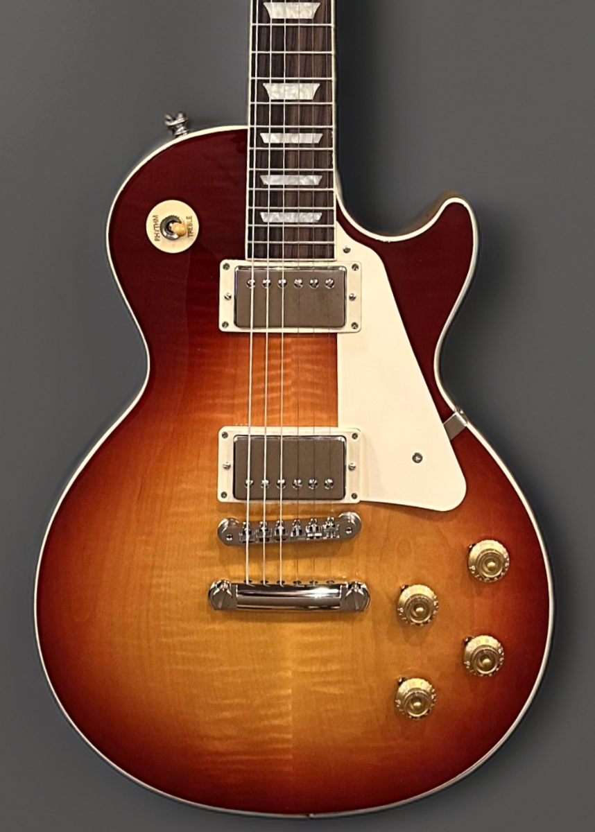 Heritage Cherry Sunburst, Gloss nitrocellulose lacquer finish, Figured Maple top on a solid Mahogany body, Vintage 50’s shaped Mahogany neck, Bound 12” radius Rosewood fingerboard with the acrylic trapezoid inlays and medium jumbo frets, 24.75” scale length, 1.69″ nut width, Burstbucker #2 bridge and Burstbucker #1 neck pickups, 3-way toggle switching with the volume and tone controls for each pickup, ABR-1 tune-o-matic bridge and aluminum stopbar tailpiece, Gibson vintage deluxe tuners, 8.9 pounds, With hardshell case