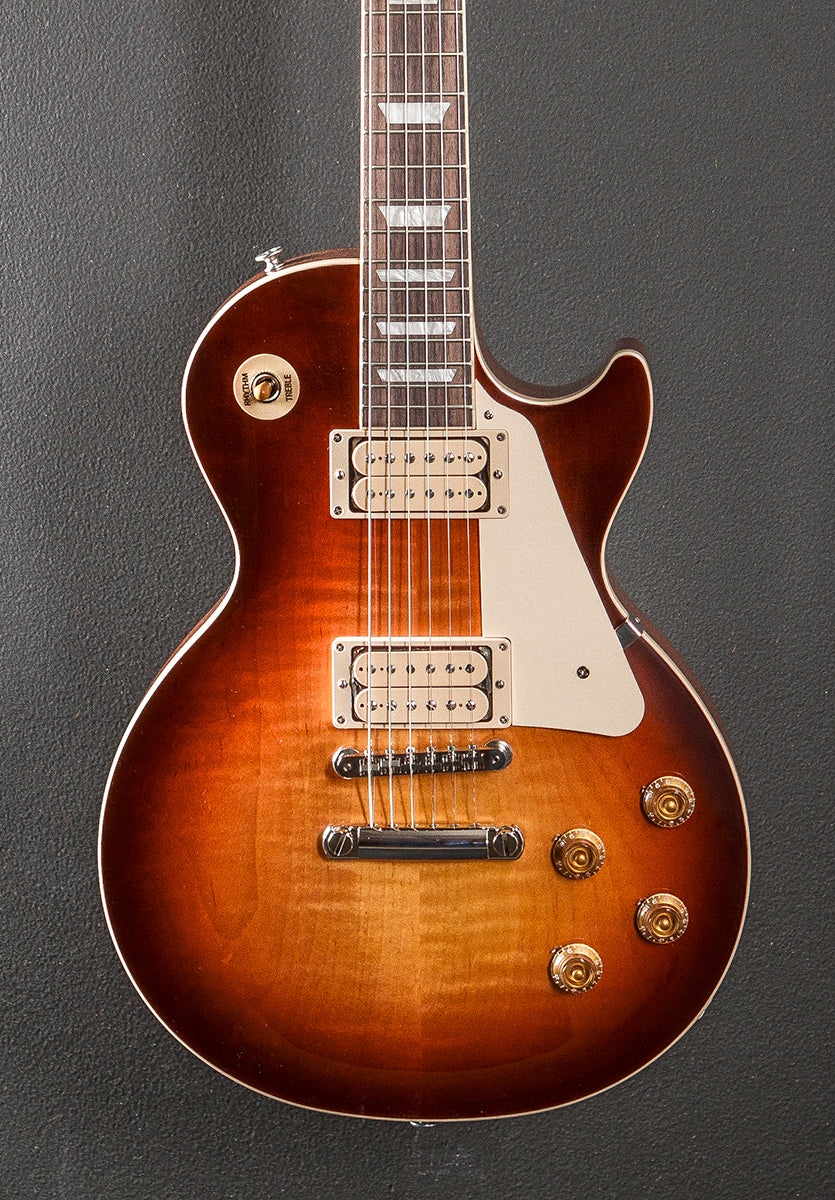 Vintage Bourbon Burst, Gloss nitrocellulose lacquer finish, AA figured Maple top on a solid Mahogany body, 50’s vintage shaped Mahogany neck, Bound 12” radius Rosewood fingerboard with the acrylic trapezoid inlays and medium jumbo frets, 24.75” scale length, 1.69″ nut width, Uncovered classic double white bobbin Burstbucker #2 bridge and Burstbucker #1 neck pickups, 3-way toggle switching with the volume and tone controls for each pickup, ABR-1 tune-o-matic bridge and aluminum stopbar tailpiece, Gibson vintage deluxe tuners, 8.4 pounds, With hardshell case