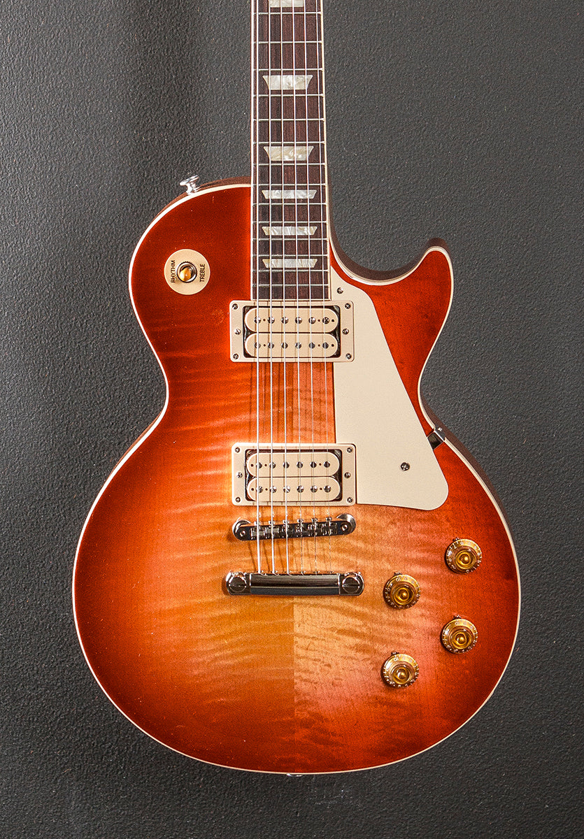 Vintage Cherry Sunburst, Gloss nitrocellulose lacquer finish, AA figured Maple top on a solid Mahogany body, 50’s vintage shaped Mahogany neck, Bound 12” radius Rosewood fingerboard with the acrylic trapezoid inlays and medium jumbo frets, 24.75” scale length, 1.69″ nut width, Uncovered classic double white bobbin Burstbucker #2 bridge and Burstbucker #1 neck pickups, 3-way toggle switching with the volume and tone controls for each pickup, ABR-1 tune-o-matic bridge and aluminum stopbar tailpiece, Gibson vintage deluxe tuners, 9.2 pounds, With hardshell case