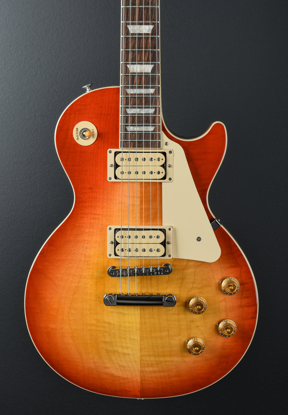 Vintage Cherry Sunburst Gloss, Gloss nitrocellulose lacquer finish, Figured AA Maple top on a solid Mahogany body, Vintage 50’s shaped Mahogany neck, Bound 12” radius Rosewood fingerboard with the acrylic trapezoid inlays and medium jumbo frets, 24.75” scale length, 1.69″ nut width, Burstbucker #2 bridge and Burstbucker #1 neck pickups with Double Classic White bobbins, 3-way toggle switching with the volume and tone controls for each pickup, ABR-1 tune-o-matic bridge and aluminum stopbar tailpiece, Gibson vintage deluxe tuners, 9.5 pounds, With hardshell case