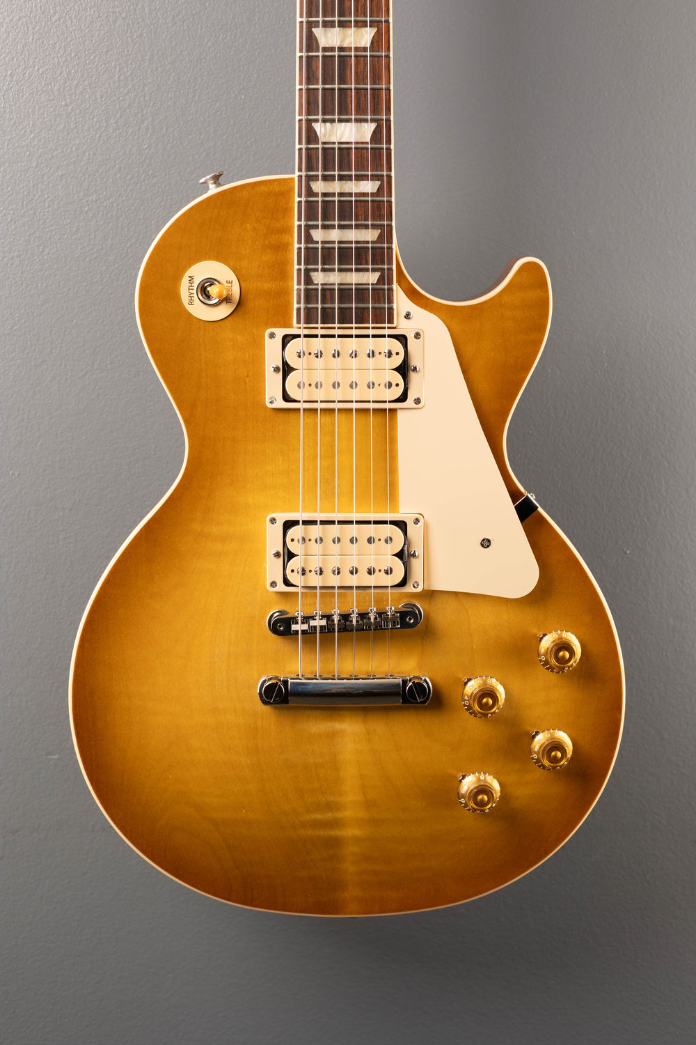 Vintage Honey Burst Gloss, Gloss nitrocellulose lacquer finish, Figured AA Maple top on a solid Mahogany body, Vintage 50’s shaped Mahogany neck, Bound 12” radius Rosewood fingerboard with the acrylic trapezoid inlays and medium jumbo frets, 24.75” scale length, 1.69″ nut width, Burstbucker #2 bridge and Burstbucker #1 neck pickups with Double Classic White bobbins, 3-way toggle switching with the volume and tone controls for each pickup, ABR-1 tune-o-matic bridge and aluminum stopbar tailpiece, Gibson vintage deluxe tuners, 10.3 pounds, With hardshell case