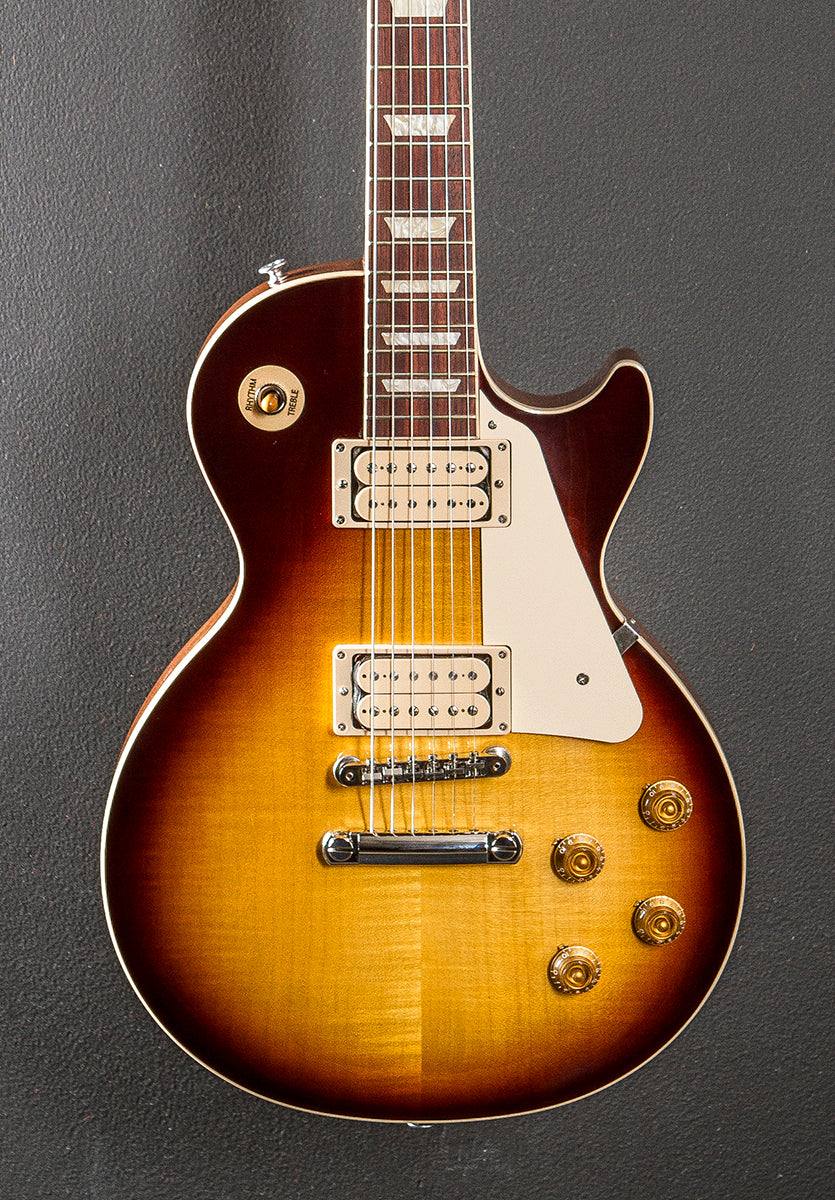 Vintage Tobacco Burst, Gloss nitrocellulose lacquer finish, AA figured Maple top on a solid Mahogany body, 50’s vintage shaped Mahogany neck, Bound 12” radius Rosewood fingerboard with the acrylic trapezoid inlays and medium jumbo frets, 24.75” scale length, 1.69″ nut width, Uncovered classic double white bobbin Burstbucker #2 bridge and Burstbucker #1 neck pickups, 3-way toggle switching with the volume and tone controls for each pickup, ABR-1 tune-o-matic bridge and aluminum stopbar tailpiece, Gibson vintage deluxe tuners, 9.2 pounds, With hardshell case