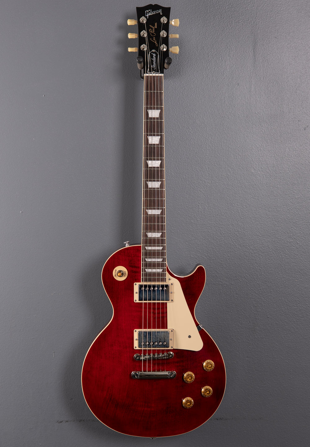 "The Les Paul™ Standard 50s Figured Top returns to the classic design that made it relevant, played, and loved–shaping sound across generations and genres of music. It pays tribute to Gibson's Golden Era of Innovation and brings authenticity back to life. It boasts a solid mahogany body, an AA figured maple top, and a distinctive translucent custom color nitrocellulose lacquer finish that showcases the figured maple top. The mahogany neck has a rounded 50s Vintage profile and a rosewood fingerboard with trapezoid inlays. The Les Paul Standard 50s Figured Top is equipped with an ABR-1, the classic-style Tune-O-Matic™ bridge, an aluminum Stop Bar tailpiece, Vintage Deluxe tuners with Keystone buttons, and gold Top Hat knobs. The calibrated Burstbucker™ 1 (neck) and Burstbucker 2 (bridge) pickups are loaded with Alnico 2 magnets and wired to audio taper potentiometers and Orange Drop® capacitors. A hardshel lcase is also included."
