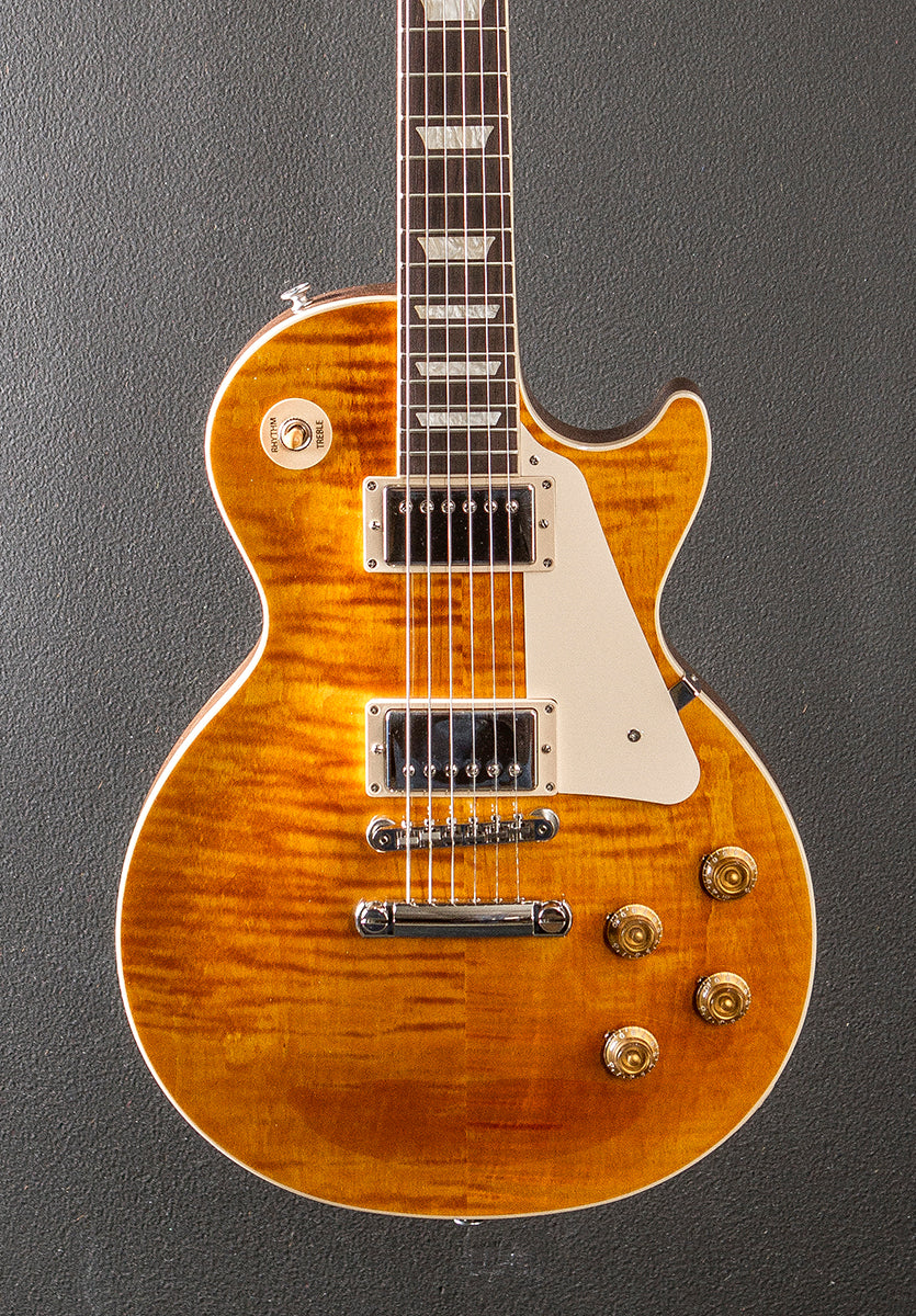 "The Les Paul™ Standard 50s Figured Top returns to the classic design that made it relevant, played, and loved – shaping sound across generations and genres of music. It pays tribute to Gibson's Golden Era of Innovation and brings authenticity back to life. It boasts a solid mahogany body, an AA figured maple top, and a distinctive translucent custom color nitrocellulose lacquer finish that showcases the figured maple top. The mahogany neck has a rounded 50s Vintage profile and a rosewood fingerboard with trapezoid inlays. The Les Paul Standard 50s Figured Top is equipped with an ABR-1, the classic-style Tune-O-Matic™ bridge, an aluminum Stop Bar tailpiece, Vintage Deluxe tuners with Keystone buttons, and gold Top Hat knobs. The calibrated Burstbucker™ 1 (neck) and Burstbucker 2 (bridge) pickups are loaded with Alnico 2 magnets and wired to audio taper potentiometers and Orange Drop® capacitors. A hardshell case is also included."