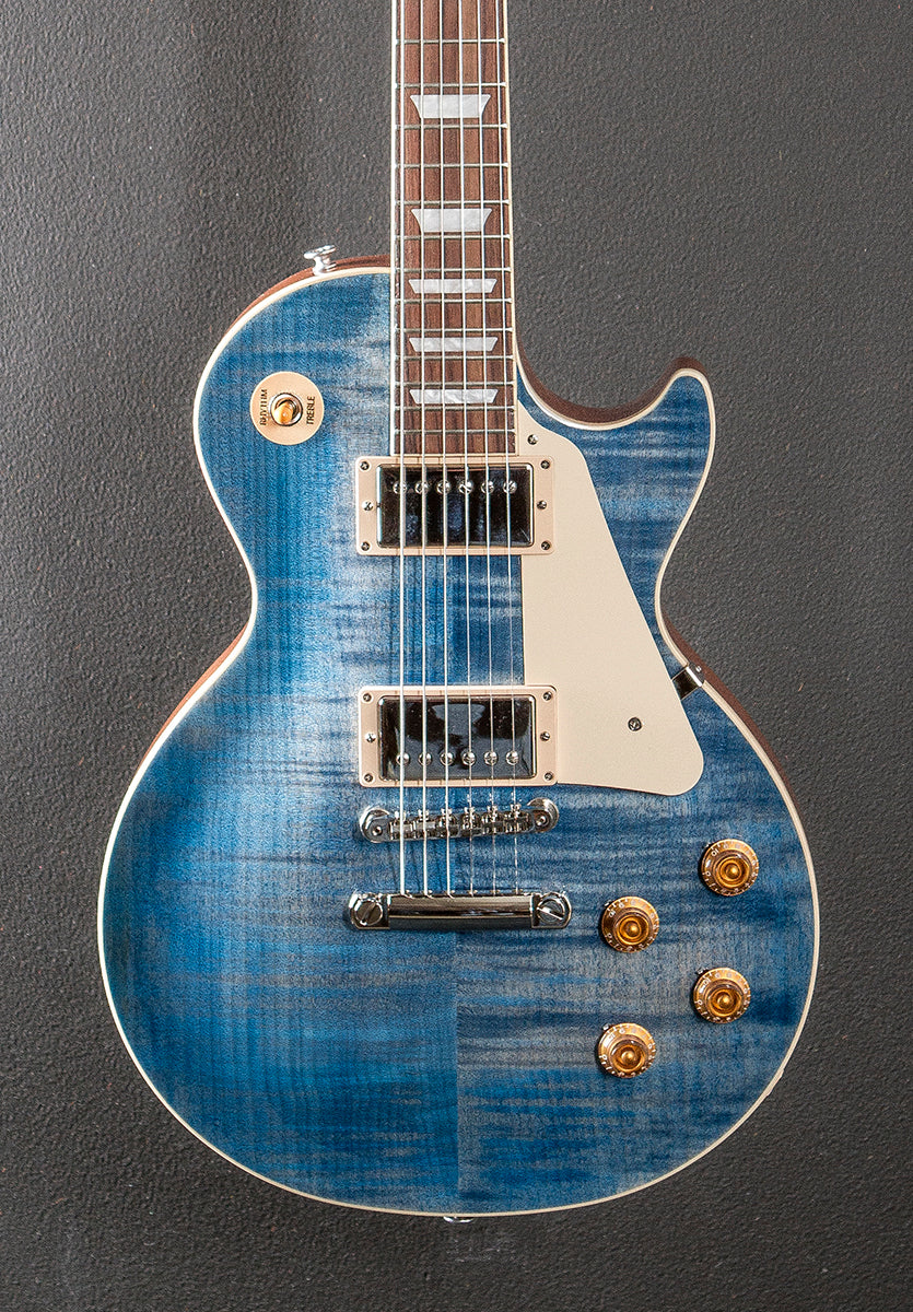 Ocean Blue, Gloss nitrocellulose lacquer finish, AA figured Maple top on a solid Mahogany body, 50’s vintage shaped Mahogany neck, Bound 12” radius Indian Rosewood fingerboard the the acrylic trapezoid inlays and medium jumbo frets, 24.75” scale length, 1.69" nut width, Burstbucker #2 bridge and Burstbucker #1 neck pickups, 3-way toggle switching with the volume and tone controls for each pickup, ABR-1 tune-o-matic bridge and aluminum stop tailpiece, Gibson vintage deluxe tuners, 9.2 pounds, With hardshell case