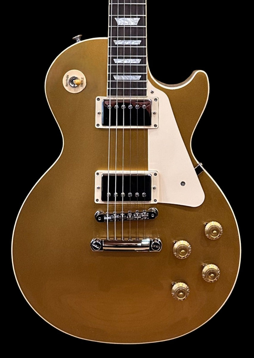 Gold Top, Gloss nitrocellulose lacquer finish, Maple top on a solid Mahogany body, Vintage 50's shaped Mahogany neck, Bound 12” radius Rosewood fingerboard with acrylic trapezoid inlays and medium jumbo frets, 24.75” scale length, 1.69″ nut width, Burstbucker #2 bridge and Burstbucker #1 neck pickups, 3-way toggle switching with the volume and tone controls for each pickup, ABR-1 tune-o-matic bridge and aluminum stopbar tailpiece, Gibson vintage deluxe tuners, 9.3 pounds, With hardshell case