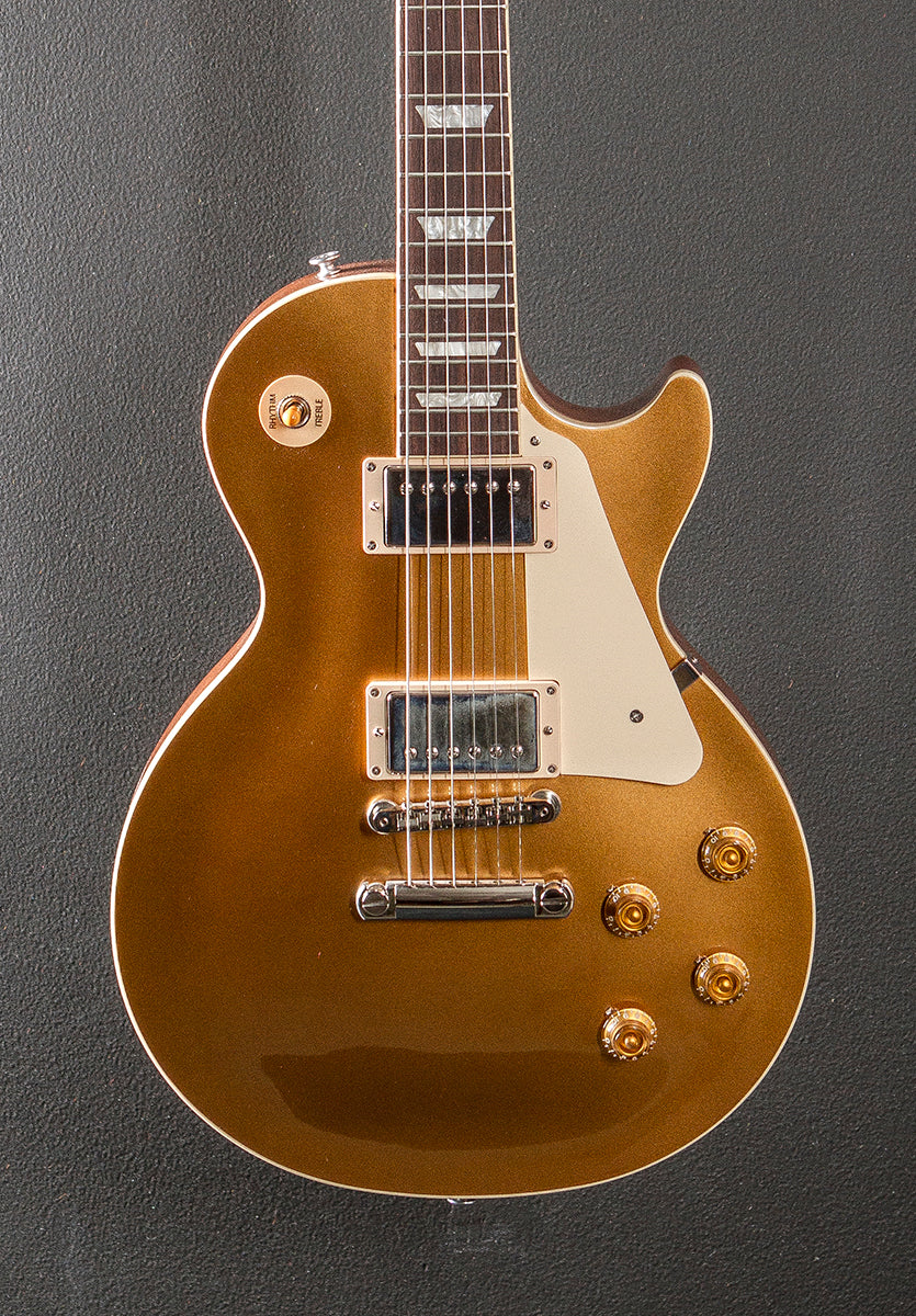 Gold Top, Gloss nitrocellulose lacquer finish, Maple top on a solid Mahogany body, Vintage 50's shaped Mahogany neck, Bound 12” radius Rosewood fingerboard with acrylic trapezoid inlays and medium jumbo frets, 24.75” scale length, 1.69″ nut width, Burstbucker #2 bridge and Burstbucker #1 neck pickups, 3-way toggle switching with the volume and tone controls for each pickup, ABR-1 tune-o-matic bridge and aluminum stopbar tailpiece, Gibson vintage deluxe tuners, 9.4 pounds, With hardshell case