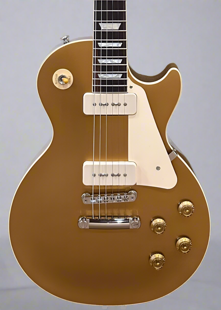 "The new Les Paul Standard returns to the classic design that made it famous. It pays tribute to Gibson's Golden Era of innovation and brings authenticity back to life. The Les Paul Standard 50s P-90 has a solid mahogany body with a maple top and a rounded 50s-style mahogany neck with a rosewood fingerboard and trapezoid inlays. It's equipped with an ABR-1, the classic-style Tune-O-Matic™ bridge, an aluminum Stop Bar tailpiece, Vintage Deluxe tuners with Keystone buttons, and aged gold Top Hat knobs. The classic P-90 pickups (neck and bridge) are loaded with Alnico 5 magnets, audio taper potentiometers, and Orange Drop® capacitors."