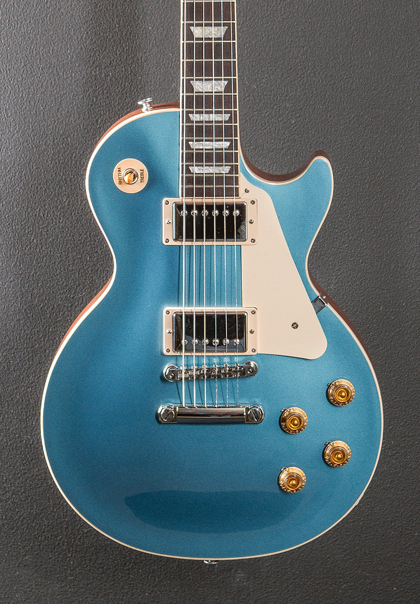 Pelham Blue, Gloss nitrocellulose lacquer finish, Plain Maple top on a solid Mahogany body, 50’s vintage shaped Mahogany neck, Bound 12” radius Indian Rosewood fingerboard the the acrylic trapezoid inlays and medium jumbo frets, 24.75” scale length, 1.69" nut width, Burstbucker #2 bridge and Burstbucker #1 neck pickups, 3-way toggle switching with the volume and tone controls for each pickup, ABR-1 tune-o-matic bridge and aluminum stop tailpiece, Gibson vintage deluxe tuners, 9.8 pounds, With hardshell case