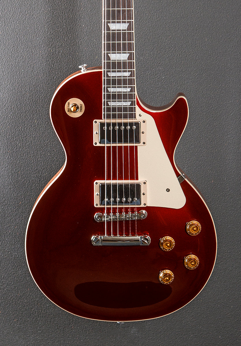 Sparkling Burgundy, Gloss nitrocellulose lacquer finish, Plain Maple top on a solid Mahogany body, 50’s vintage shaped Mahogany neck, Bound 12” radius Indian Rosewood fingerboard the the acrylic trapezoid inlays and medium jumbo frets, 24.75” scale length, 1.69" nut width, Burstbucker #2 bridge and Burstbucker #1 neck pickups, 3-way toggle switching with the volume and tone controls for each pickup, ABR-1 tune-o-matic bridge and aluminum stop tailpiece, Gibson vintage deluxe tuners, 9.4 pounds, With hardshell case