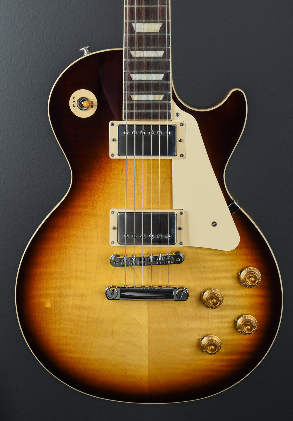 "The new Les Paul Standard returns to the classic design that made it relevant, played and loved -- shaping sound across generations and genres of music. It pays tribute to Gibson's Golden Era of innovation and brings authenticity back to life. The Les Paul Standard 50's has a solid mahogany body with a maple top, a rounded 50's-style mahogany neck with a rosewood fingerboard and trapezoid inlays. It's equipped with an ABR-1, the classic-style Tune-O-Matic bridge, aluminum stop bar tailpiece, vintage deluxe tuners with keystone buttons, and aged gold tophat knobs. The calibrated Burstbucker 1 (neck) and Burstbucker 2 (bridge) pickups are loaded with AlNiCo II magnets, audio taper potentiometers and orange drop capacitors."