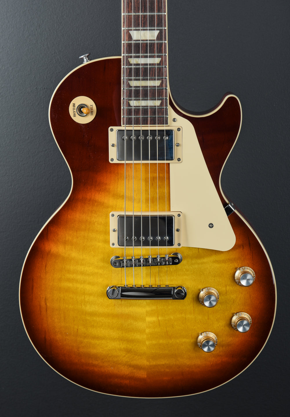 Iced Tea, Gloss nitrocellulose lacquer finish, AA figured Maple top on a solid Mahogany body, Slim taper shaped Mahogany neck, Bound 12” radius Rosewood fingerboard with the acrylic trapezoid inlays and medium jumbo frets, 24.75” scale length, 1.69″ nut width, 60's Burstbucker bridge and neck pickups, 3-way toggle switching with the volume and tone controls for each pickup, ABR-1 tune-o-matic bridge and aluminum stopbar tailpiece, Grover Rotomatic tuners, 9.4 pounds, With hardshell case
