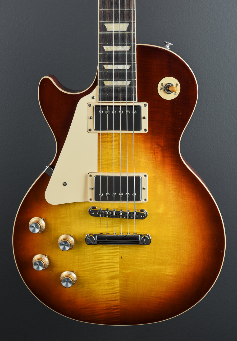 Iced Tea, Gloss nitrocellulose lacquer finish, AA figured Maple top on a solid Mahogany body, Slim taper shaped Mahogany neck, Bound 12” radius Rosewood fingerboard with the acrylic trapezoid inlays and medium jumbo frets, 24.75” scale length, 1.69″ nut width, 60's Burstbucker bridge and neck pickups, 3-way toggle switching with the volume and tone controls for each pickup, ABR-1 tune-o-matic bridge and aluminum stopbar tailpiece, Grover Rotomatic tuners, 9.4 pounds, With hardshell case