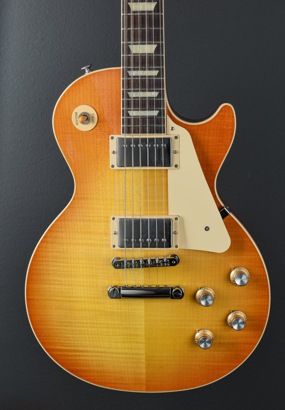 “The new Les Paul Standard returns to the classic design that made it relevant, played and loved -- shaping sound across generations and genres of music. It pays tribute to Gibson's Golden Era of innovation and brings authenticity back to life. The Les Paul Standard 60's has a solid mahogany body with an AA figured maple top, and a slim taper 60's-style mahogany neck with a rosewood fingerboard and trapezoid inlays. It's equipped with a classic-style Tune-O-Matic bridge, aluminum stop bar tailpiece, Grover Rotomatic "Kidney" tuners, and gold top hat knobs with silver reflectors. The Burstbucker 61R (neck) Burstbucker 61T (bridge) pickups are loaded with AlNiCo V magnets, audio taper potentiometers and orange drop capacitors."