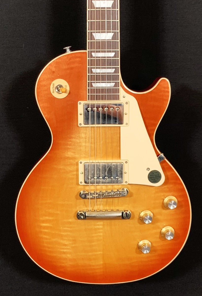 Unburst, Gloss nitrocellulose lacquer finish, AA figured Maple top on a Mahogany body, Slim taper shaped Mahogany neck, Bound 12” radius Rosewood fingerboard with the acrylic trapezoid inlays and medium jumbo frets, 24.75” scale length, 1.69″ nut width, Burstbucker 61T bridge and Burstbucker 61R neck pickups, 3-way toggle switching with the volume and tone controls for each pickup, ABR-1 tune-o-matic bridge and aluminum stopbar tailpiece, Grover Rotomatic tuners, 9.8 pounds, With hardshell case