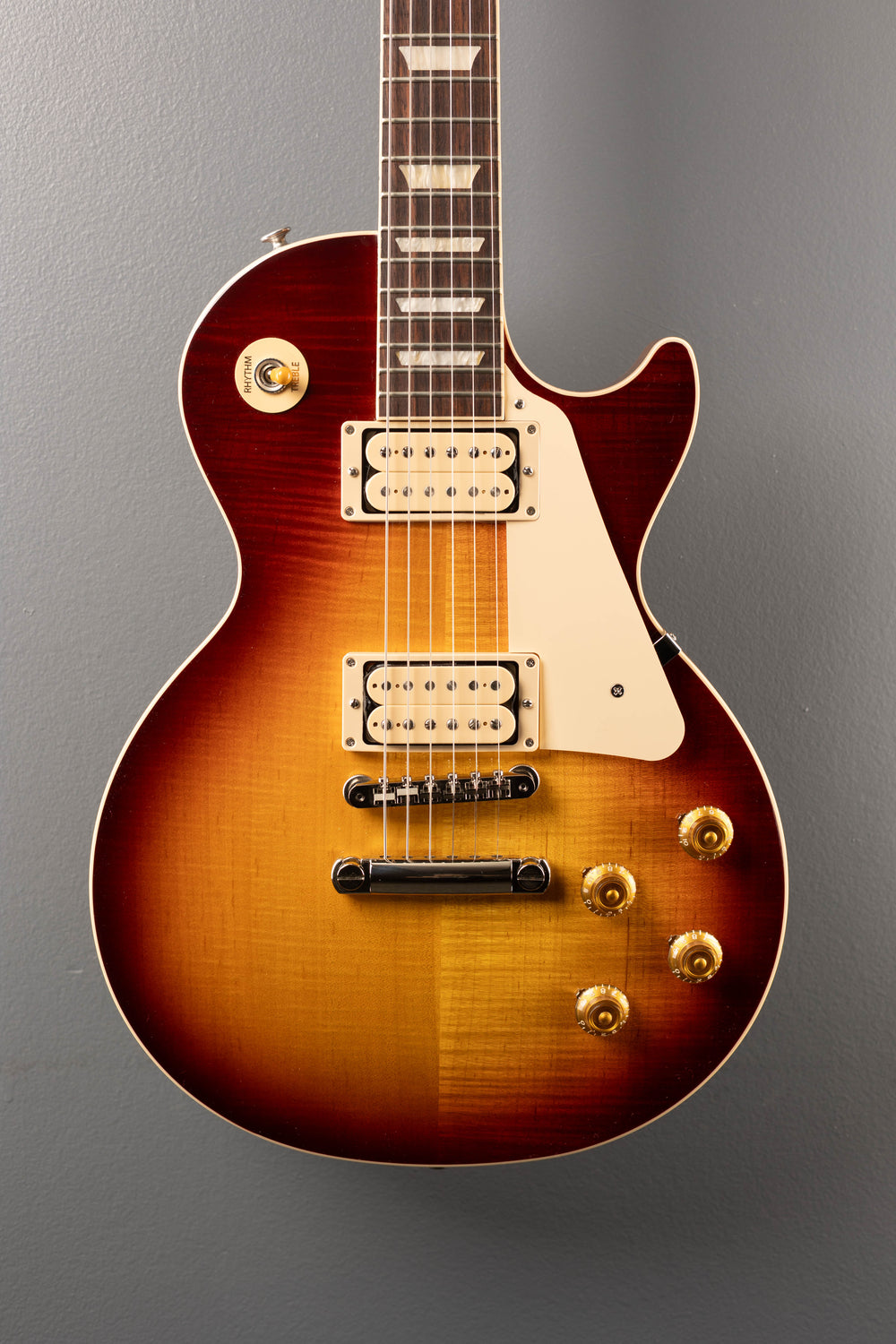 Vintage Bourbon Burst Gloss, Gloss nitrocellulose lacquer finish, Figured AA Maple top on a solid Mahogany body, Vintage 50’s shaped Mahogany neck, Bound 12” radius Rosewood fingerboard with the acrylic trapezoid inlays and medium jumbo frets, 24.75” scale length, 1.69″ nut width, Burstbucker #2 bridge and Burstbucker #1 neck pickups with Double Classic White bobbins, 3-way toggle switching with the volume and tone controls for each pickup, ABR-1 tune-o-matic bridge and aluminum stopbar tailpiece, Gibson vintage deluxe tuners, 9.2 pounds, With hardshell case