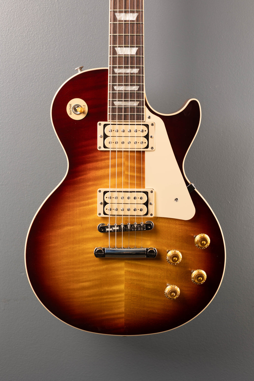 Vintage Bourbon Burst Gloss, Gloss nitrocellulose lacquer finish, Figured AA Maple top on a solid Mahogany body, Vintage 50’s shaped Mahogany neck, Bound 12” radius Rosewood fingerboard with the acrylic trapezoid inlays and medium jumbo frets, 24.75” scale length, 1.69″ nut width, Burstbucker #2 bridge and Burstbucker #1 neck pickups with Double Classic White bobbins, 3-way toggle switching with the volume and tone controls for each pickup, ABR-1 tune-o-matic bridge and aluminum stopbar tailpiece, Gibson vintage deluxe tuners, 9.5 pounds, With hardshell case