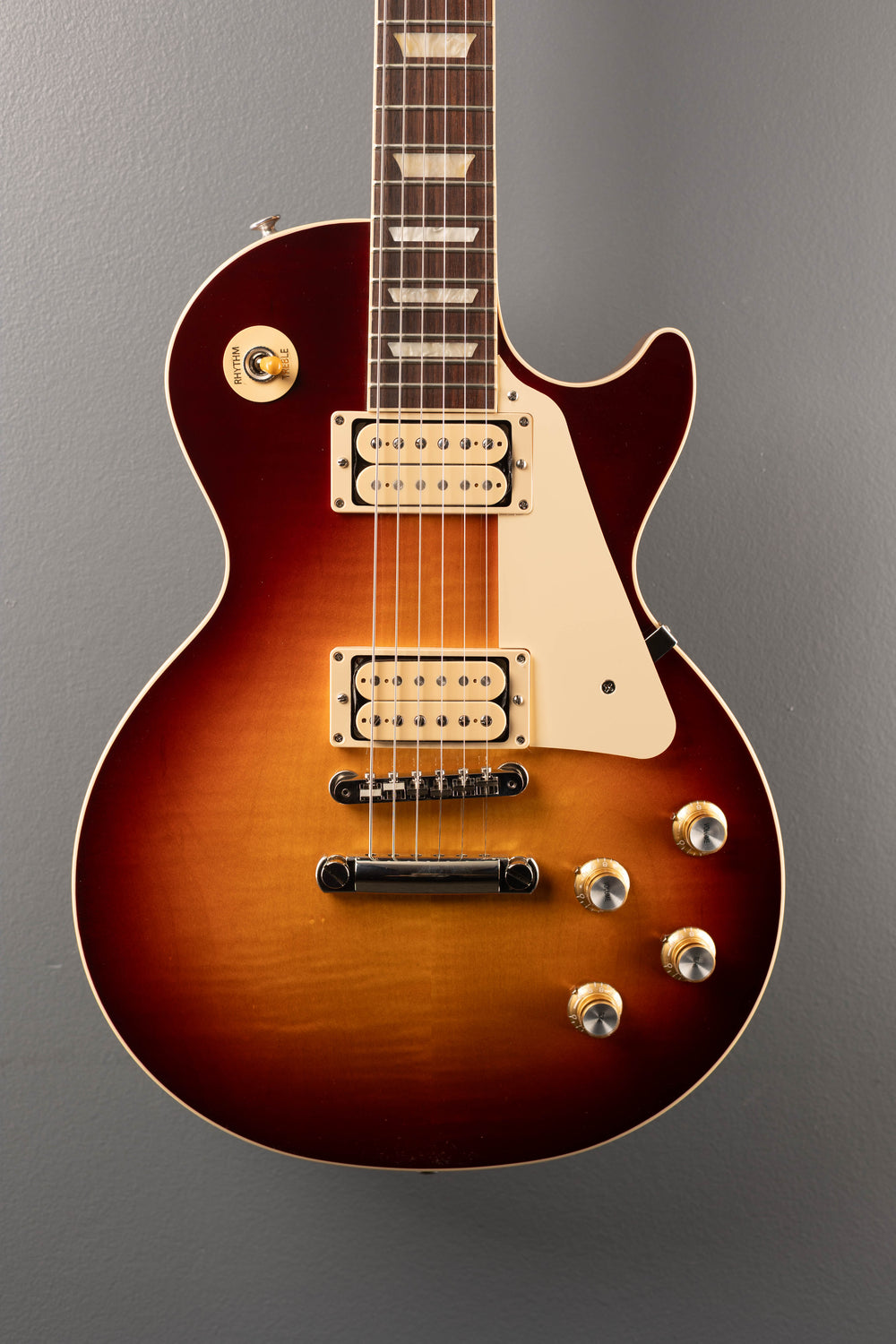 Vintage Bourbon Burst, Gloss nitrocellulose lacquer finish, AA figured Maple top on a solid Mahogany body, Slim taper shaped Mahogany neck, Bound 12” radius Rosewood fingerboard with the acrylic trapezoid inlays and medium jumbo frets, 24.75” scale length, 1.69″ nut width, Uncovered classic double white bobbin Burstbucker 61T bridge and Burstbucker 61R neck pickups, 3-way toggle switching with the volume and tone controls for each pickup, ABR-1 tune-o-matic bridge and aluminum stopbar tailpiece, Grover Rotomatic tuners, 8.7 pounds, With hardshell case