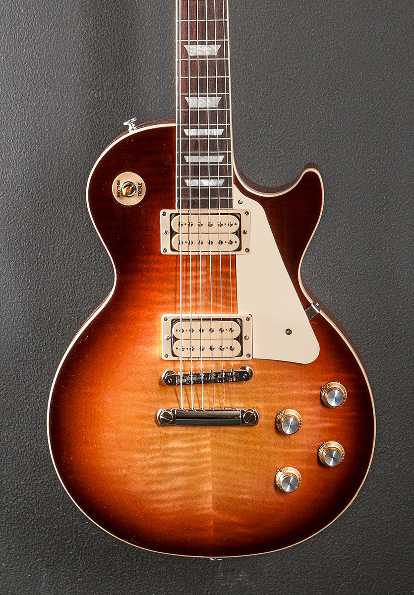 Vintage Bourbon Burst, Gloss nitrocellulose lacquer finish, AA figured Maple top on a solid Mahogany body, Slim taper shaped Mahogany neck, Bound 12” radius Rosewood fingerboard with the acrylic trapezoid inlays and medium jumbo frets, 24.75” scale length, 1.69″ nut width, Uncovered classic double white bobbin Burstbucker 61T bridge and Burstbucker 61R neck pickups, 3-way toggle switching with the volume and tone controls for each pickup, ABR-1 tune-o-matic bridge and aluminum stopbar tailpiece, Grover Rotomatic tuners, 9.2 pounds, With hardshell case