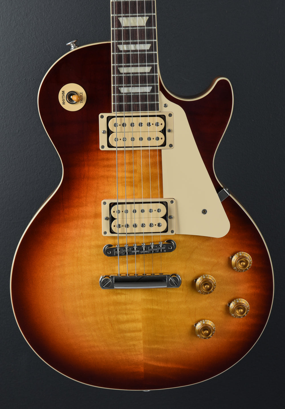 Vintage Bourbon Burst Gloss, Gloss nitrocellulose lacquer finish, Figured AA Maple top on a solid Mahogany body, Vintage 50’s shaped Mahogany neck, Bound 12” radius Rosewood fingerboard with the acrylic trapezoid inlays and medium jumbo frets, 24.75” scale length, 1.69″ nut width, Burstbucker #2 bridge and Burstbucker #1 neck pickups with Double Classic White bobbins, 3-way toggle switching with the volume and tone controls for each pickup, ABR-1 tune-o-matic bridge and aluminum stopbar tailpiece, Gibson vintage deluxe tuners, 8.7 pounds, With hardshell case