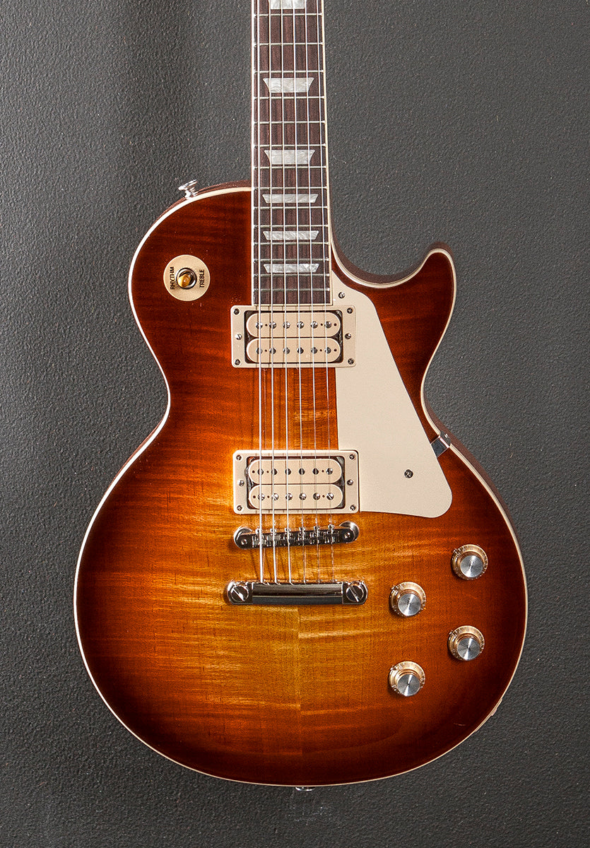 Vintage Bourbon Burst, Gloss nitrocellulose lacquer finish, AA figured Maple top on a solid Mahogany body, Slim taper shaped Mahogany neck, Bound 12” radius Rosewood fingerboard with the acrylic trapezoid inlays and medium jumbo frets, 24.75” scale length, 1.69″ nut width, Uncovered classic double white bobbin Burstbucker 61T bridge and Burstbucker 61R neck pickups, 3-way toggle switching with the volume and tone controls for each pickup, ABR-1 tune-o-matic bridge and aluminum stopbar tailpiece, Grover Rotomatic tuners, 9.8 pounds, With hardshell case