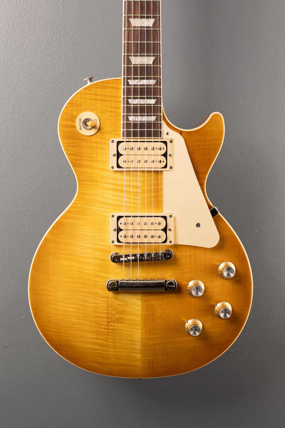 Vintage Bourbon Burst, Gloss nitrocellulose lacquer finish, AA figured Maple top on a solid Mahogany body, Slim taper shaped Mahogany neck, Bound 12” radius Rosewood fingerboard with the acrylic trapezoid inlays and medium jumbo frets, 24.75” scale length, 1.69″ nut width, Uncovered classic double white bobbin Burstbucker 61T bridge and Burstbucker 61R neck pickups, 3-way toggle switching with the volume and tone controls for each pickup, ABR-1 tune-o-matic bridge and aluminum stopbar tailpiece, Grover Rotomatic tuners, 9.4 pounds, With hardshell case