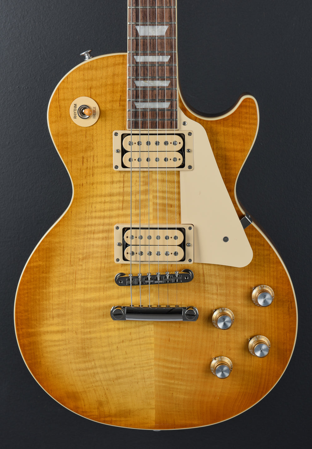 Vintage Bourbon Burst, Gloss nitrocellulose lacquer finish, AA figured Maple top on a solid Mahogany body, Slim taper shaped Mahogany neck, Bound 12” radius Rosewood fingerboard with the acrylic trapezoid inlays and medium jumbo frets, 24.75” scale length, 1.69″ nut width, Uncovered classic double white bobbin Burstbucker 61T bridge and Burstbucker 61R neck pickups, 3-way toggle switching with the volume and tone controls for each pickup, ABR-1 tune-o-matic bridge and aluminum stopbar tailpiece, Grover Rotomatic tuners, 9.4 pounds, With hardshell case