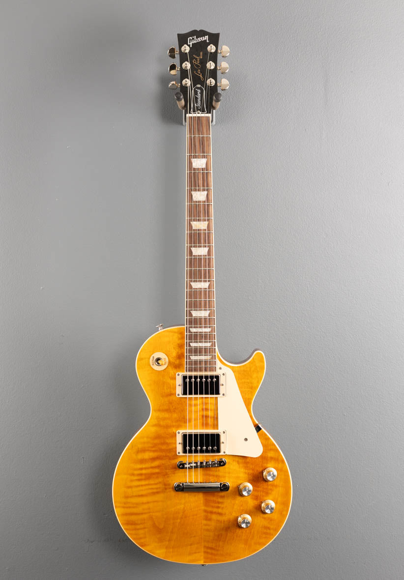 "The Les Paul™ Standard 60s Figured Top returns to the classic design that made it relevant, played, and loved – shaping sound across generations and genres of music. It pays tribute to Gibson's Golden Era of Innovation and brings authenticity back to life. The Les Paul Standard 60s Figured Top has a solid mahogany body with an AA figured maple top visible beneath the new head-turning translucent custom color nitrocellulose lacquer finish. The mahogany neck has a 60s-style SlimTaper™ profile and a rosewood fingerboard with trapezoid inlays. The Les Paul Standard 60s Figured Top is equipped with a classic ABR-1 Tune-O-Matic™ bridge, aluminum Stop Bar tailpiece, Grover® Rotomatic® "Kidney" tuners, and gold Top Hat knobs with silver reflectors. The 60s Burstbucker™ pickups are loaded with Alnico 5 magnets and wired to audio taper potentiometers and Orange Drop® capacitors. A hardshell case is also included."