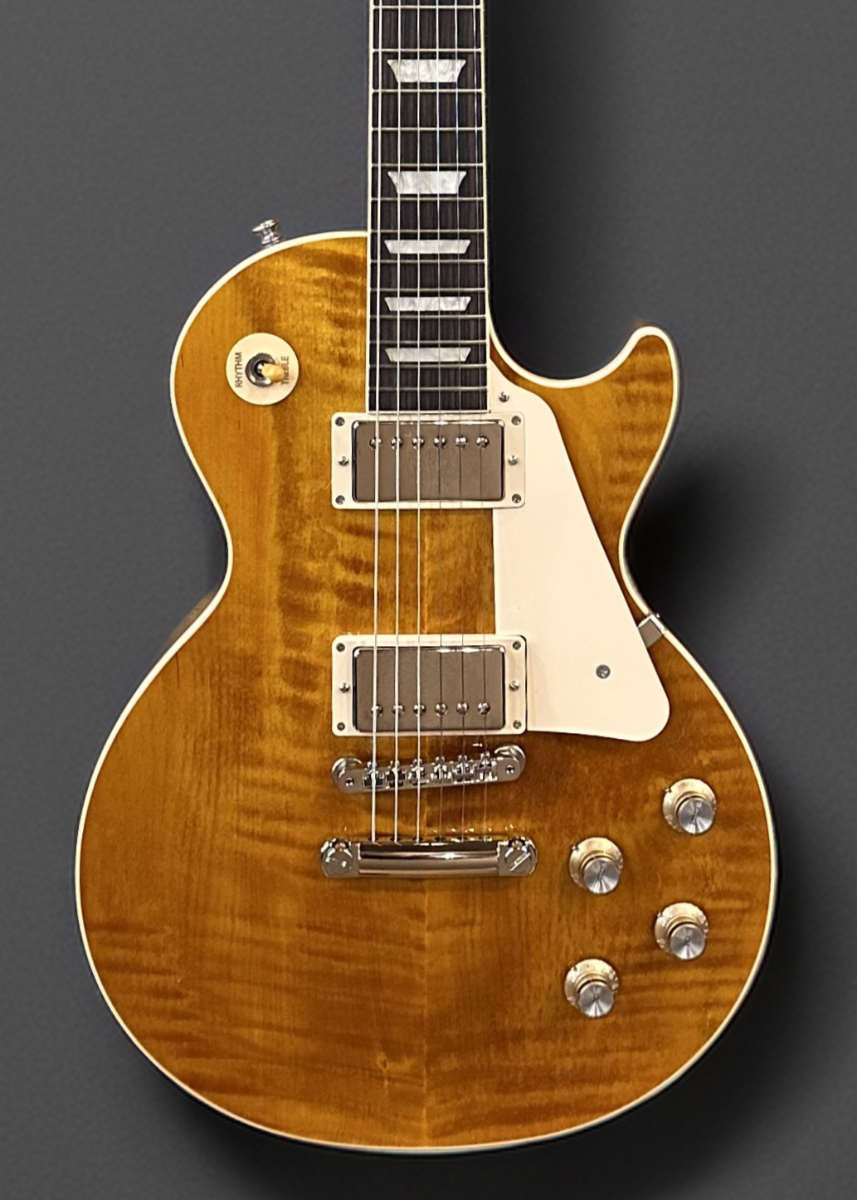 Honey Amber, Gloss nitrocellulose lacquer finish, AA figured Maple top on a Mahogany body, Slim taper shaped Mahogany neck, Bound 12” radius Rosewood fingerboard with the acrylic trapezoid inlays and medium jumbo frets, 24.75” scale length, 1.69″ nut width, 60's Burstbucker bridge and neck pickups, 3-way toggle switching with the volume and tone controls for each pickup, ABR-1 tune-o-matic bridge and aluminum stopbar tailpiece, Grover Rotomatic tuners, 10 pounds, With hardshell case