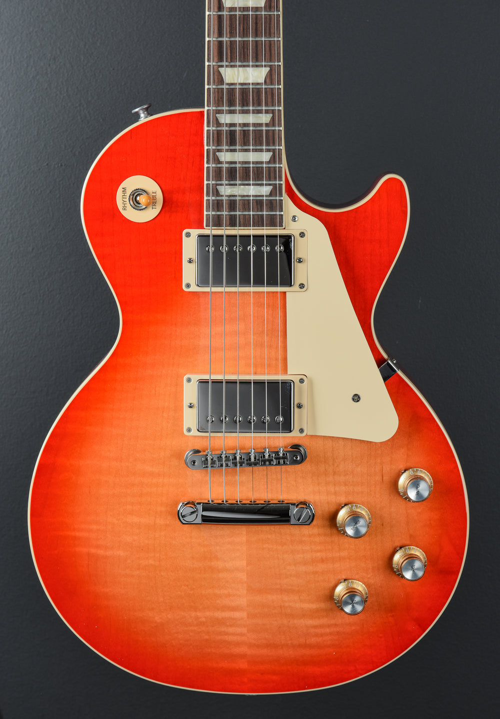 Tomato Soup Burst, Gloss nitrocellulose lacquer finish, AA figured Maple top on a solid Mahogany body, Slim taper shaped Mahogany neck, Bound 12” radius Indian Rosewood fingerboard the the acrylic trapezoid inlays and medium jumbo frets, 24.75” scale length, 1.69" nut width, Gibson Lead T bridge and Rhy T neck pickups, 3-way toggle switching with the volume and tone controls for each pickup, ABR-1 tune-o-matic bridge and aluminum stop tailpiece, Grover Rotomatic tuners, 8.6 pounds, With hardshell case