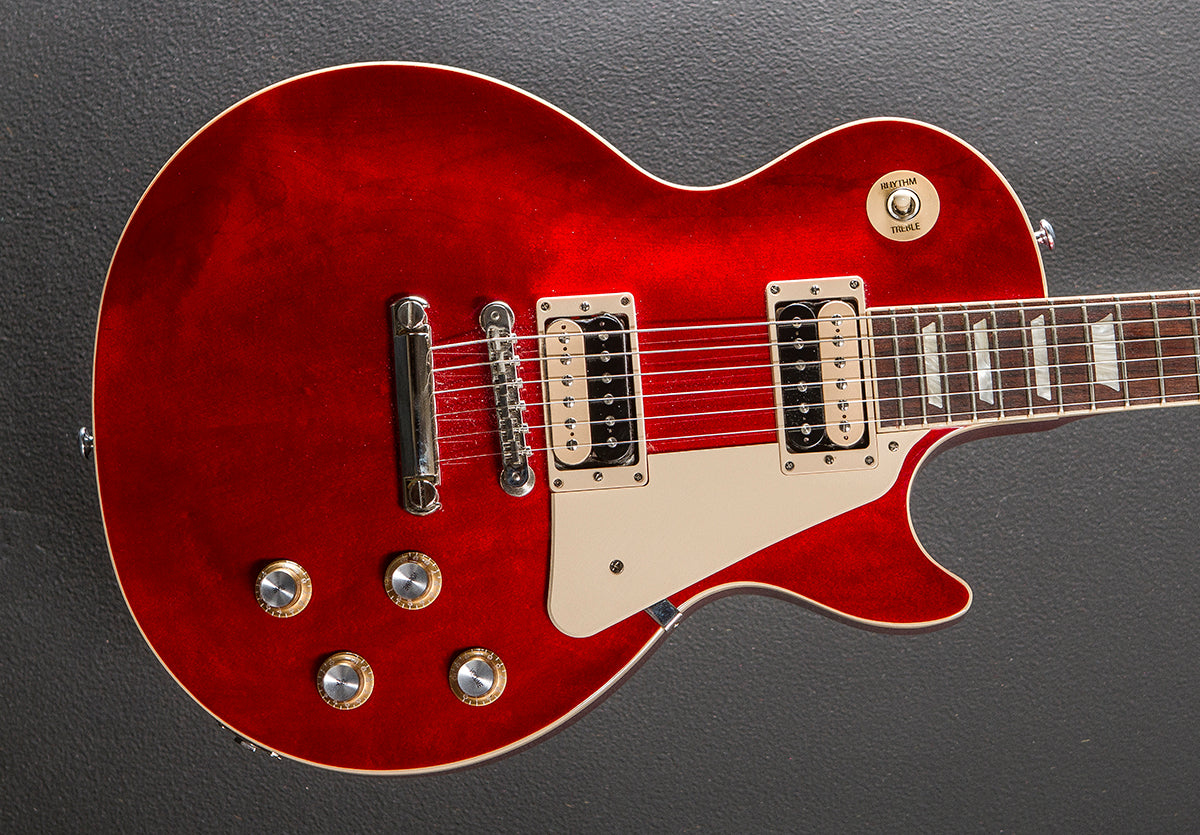 Translucent Cherry, Gloss nitrocellulose lacquer finish, Maple top on a nine hole weight relieved Mahogany body, Slim taper shaped Mahogany neck, Bound 12” radius Rosewood fingerboard with the acrylic trapezoid inlays and medium jumbo frets, 24.75″ scale length, 1 11/16th″ nut width, Gibson zebra coil 60's Burstbucker bridge and neck pickups, 3-way toggle switching with the push/pull coil tap volume and push/pull pure bypass/phase tone controls for each pickup, ABR-1 tune-o-matic bridge and aluminum stop tailpiece, Grover Rotomatic tuners, The neck thickness is .80″ at the first and .92″ at the 12th frets, 9.6 pounds, With the Gibson hardshell case, Excellent