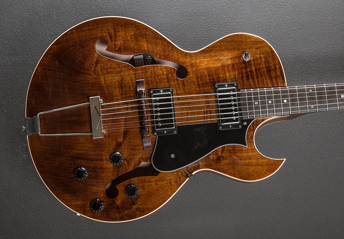 Transparent Brown, Gloss nitrocellulose lacquer finish, 16" wide hollow Curly Maple body, Cream binding, Standard shaped Mahogany neck, 12” radius Rosewood fingerboard with the pearl dot inlays and medium jumbo frets, 24.75" scale length, 1 11/16th" nut width, Seymour Duncan Seth Lover bridge and neck pickups, 3-way toggle switching with the volume and tone controls for each pickup, Adjustable Rosewood bridge and trapeze tailpiece, Heritage cast/sealed tuners, The neck thickness is .81″ at the first and .92″ at the 9th frets, 6.8 pounds, With the Heritage hardshell case, Excellent