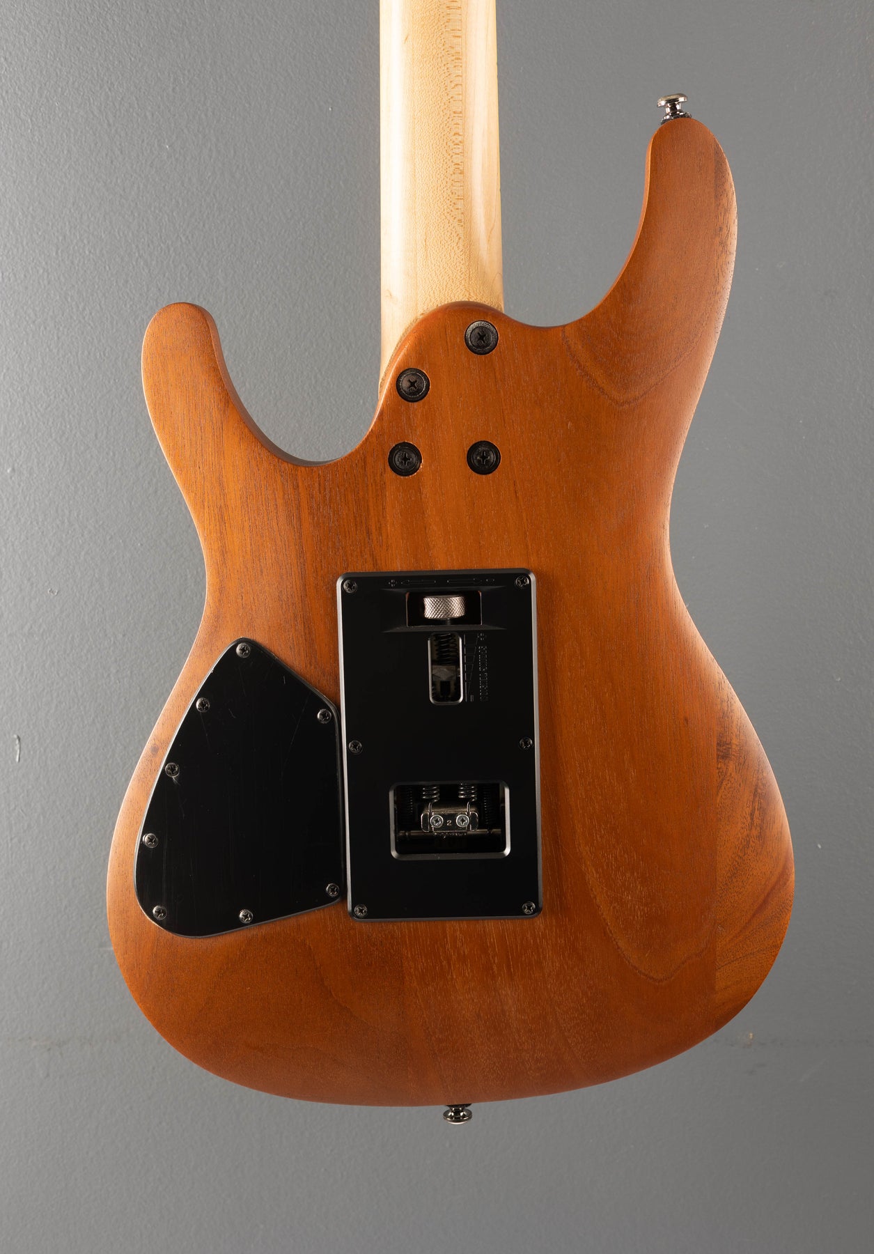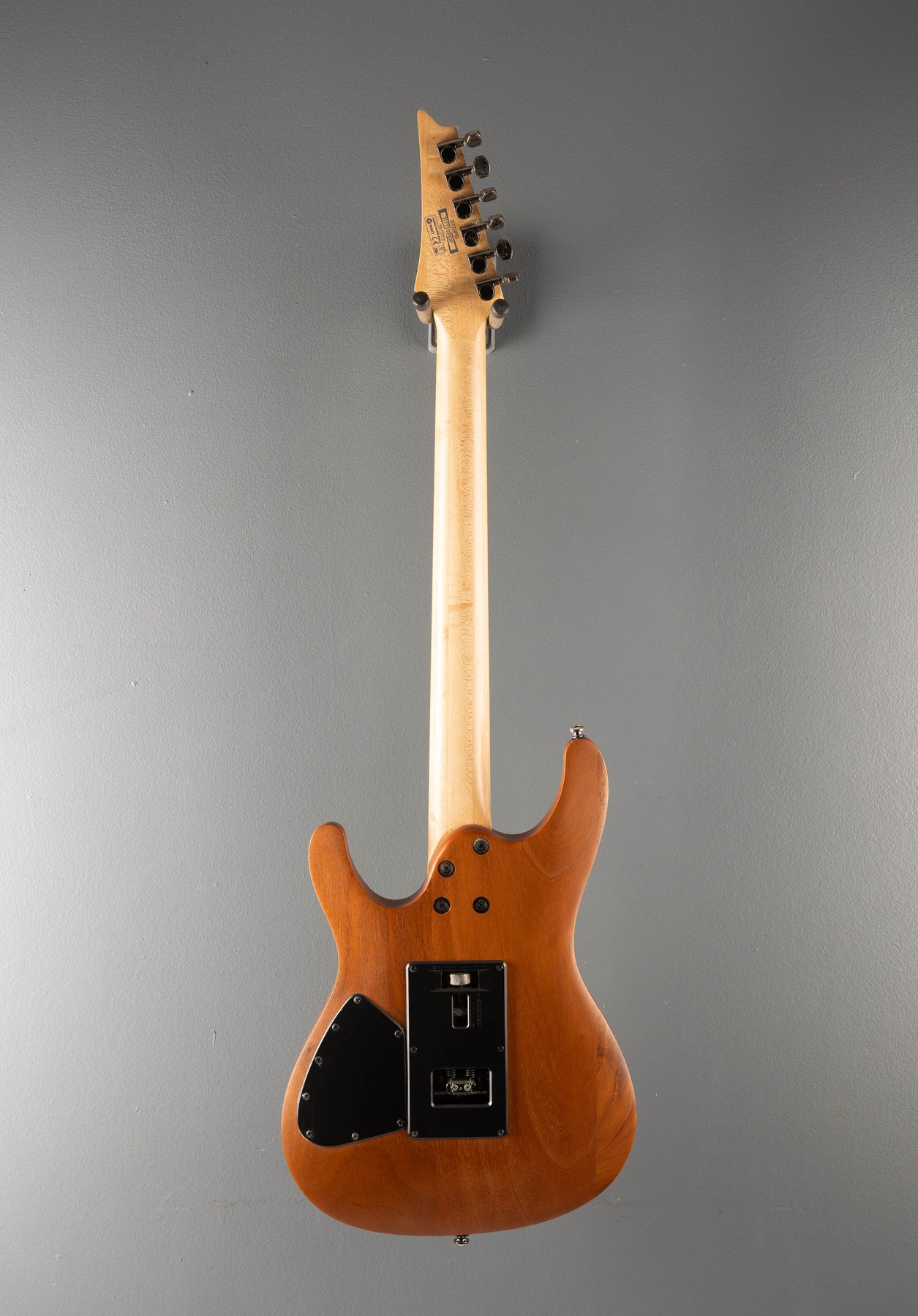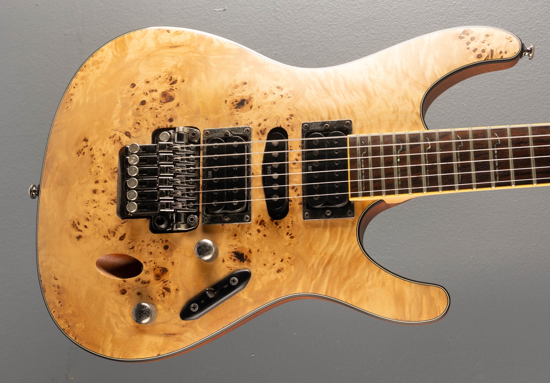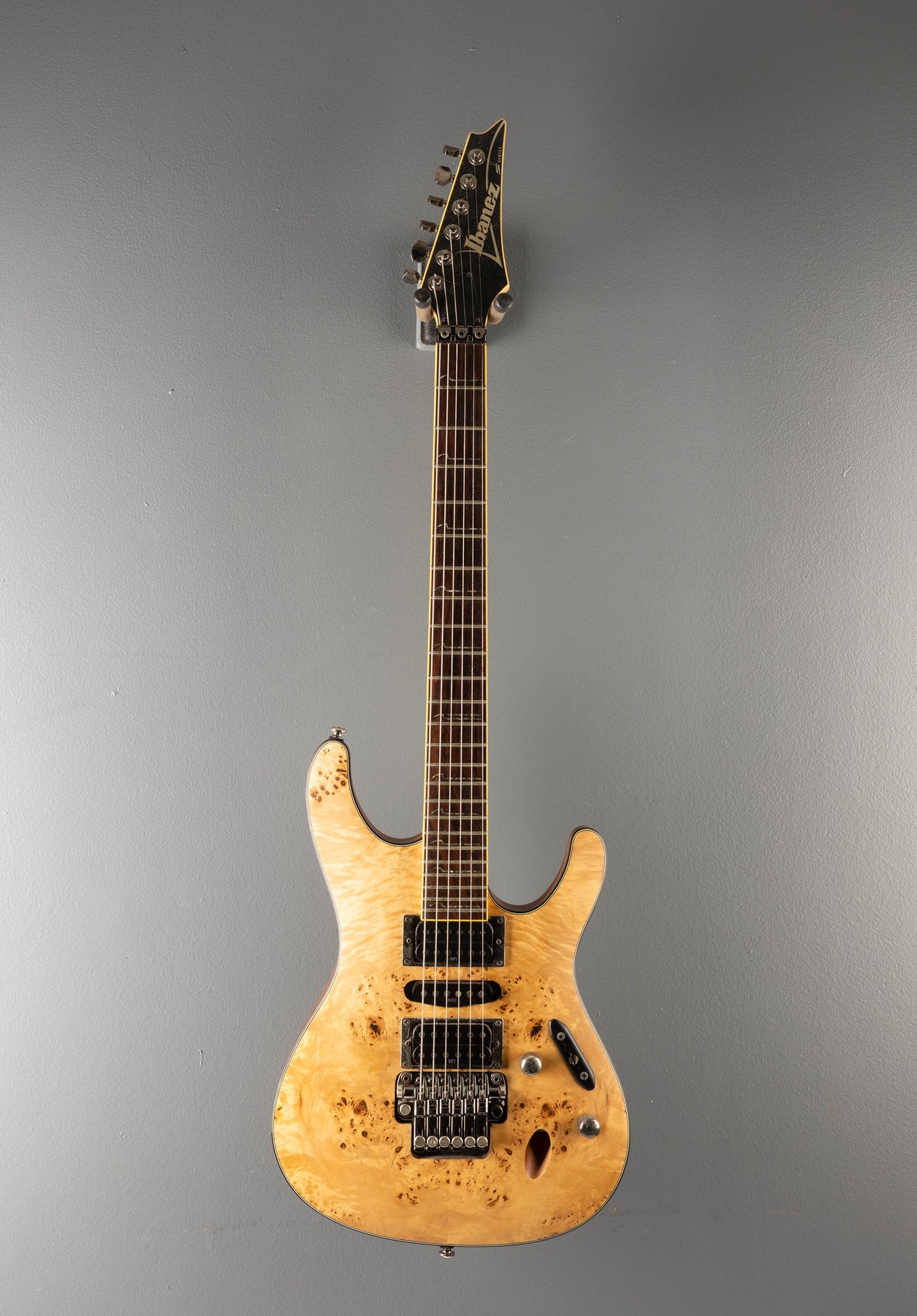 Very Good Condition, Natural Flat, Poplar Burl top on a Mahogany Body, Bound 15.75" radius Rosewood fingerboard with S Wave inlays and Jumbo frets on a Wizard III shaped 3 piece Maple Neck, 25.5" scale length, 1 11/16" nut width, Factory Ibanez INF pickups, 5 way switching with volume and tone controls, ZR tremolo bridge w/ ZPS2, closed gear tuners, 7.1 pounds, with hardshell case.