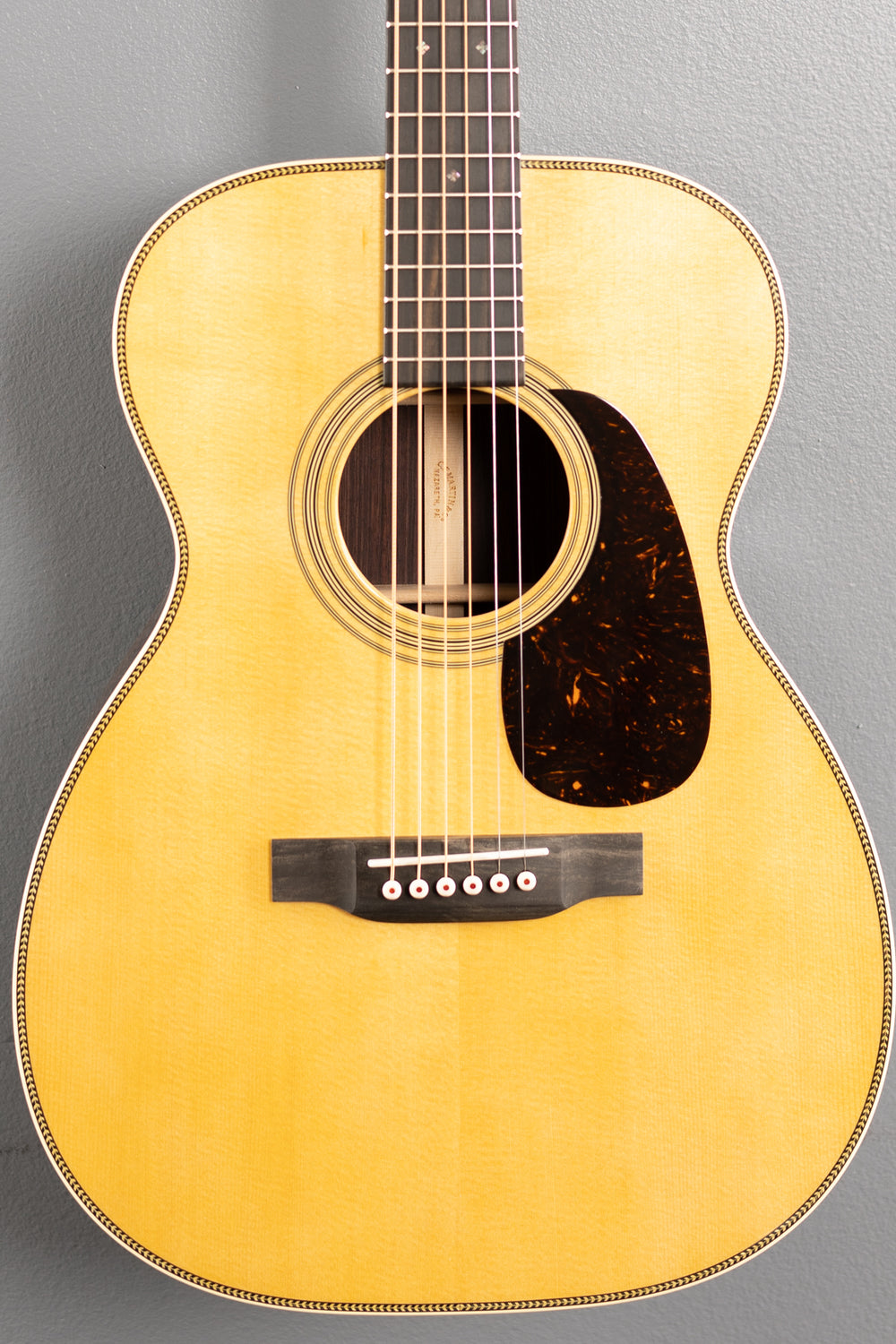 Natural, 00-14 Fret body shape, Solid Sitka Spruce top, Scalloped X bracing, Multi-stripe Rosette, Antique White binding with the Bold Herringbone top and multi-stripe back inlay, East Indian Rosewood back and sides, Style 28 back purfling, Ebony fingerboard with the Abalone long pattern Diamond and Squares position markers on a Modified Low Oval w/high performance taper shaped select hardwood neck, 24.9″ scale length, 1 3/4” width at the nut, With hardshell case