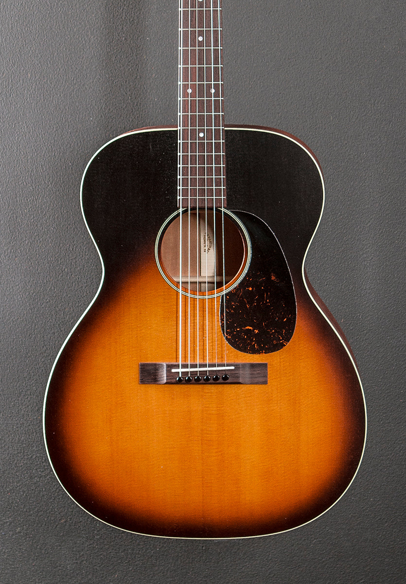 Whiskey Sunset Burst top, Satin finish, 000-14 Fret body shape, Solid Spruce top, Multi-stripe Rosette, Scalloped X bracing, Mahogany back and sides, Antique White binding, Modified low oval w/high performance taper shaped select hardwood neck, 16" radius Rosewood fingerboard with the Mother of Pearl 1955 Style 18 position markers, 24.9" scale length, 1 3/4" nut width, Golden Age Relic Nickel tuners, With the Martin soft case