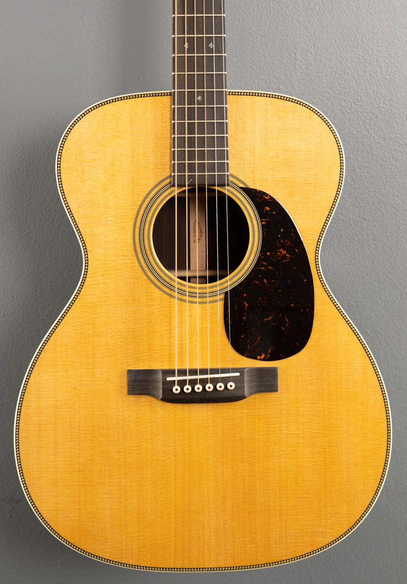 Natural, 000-14 Fret body shape, Solid Spruce top, Scalloped X bracing, Multi-stripe Rosette, Antique White binding with the Bold Herringbone top and multi-stripe back inlay, East Indian Rosewood back and sides, Style 28 back purfling, Ebony fingerboard with the Abalone long pattern Diamond and Squares position markers on a Modified Low Oval w/high performance taper shaped select hardwood neck, 24.9″ scale length, 1 3/4” width at the nut, with hardshell case