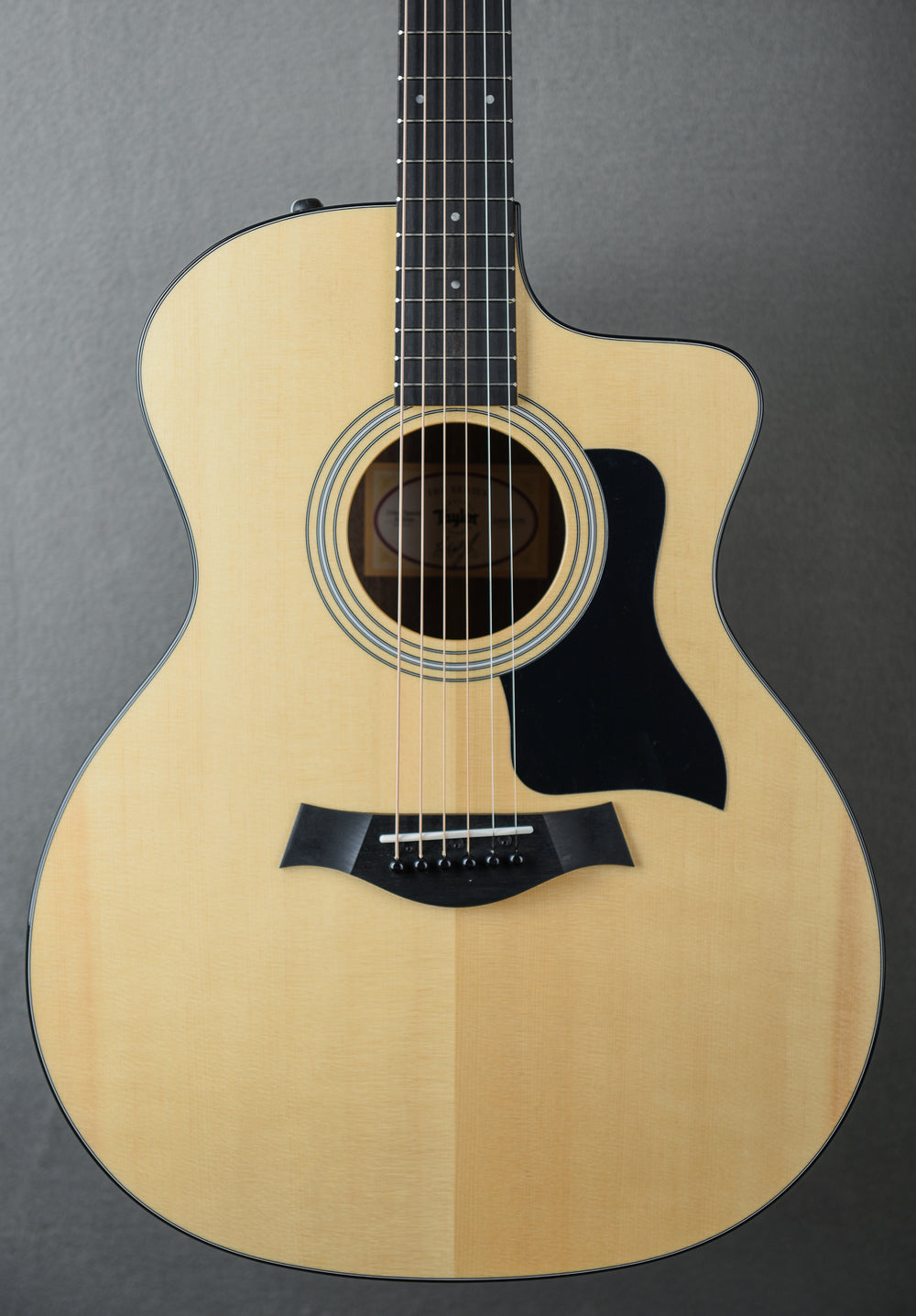 "This cutaway acoustic/electric Grand Auditorium blends layered walnut back and sides with a solid Sitka spruce top, making it a great all-around acoustic that responds well to strumming, flatpicking and fingerpicking. With our patented Taylor neck, you’ll enjoy easy playability and accurate intonation as long as you own the guitar, and the slightly narrower 1-11/16-inch nut width makes forming barre chords easier on the hands. The Venetian cutaway gives you access to more upper-end fretboard real estate, while our dynamic Expression System 2 pickup produces a natural amplified acoustic voice that will help you sound your best whenever you plug in. The clean appointment scheme includes Italian acrylic dot fretboard inlays, a 3-ring rosette, plus black binding and a black pickguard that complement the look of the genuine ebony fretboard and bridge. The guitar includes a lightweight protective gig bag for easy portability."