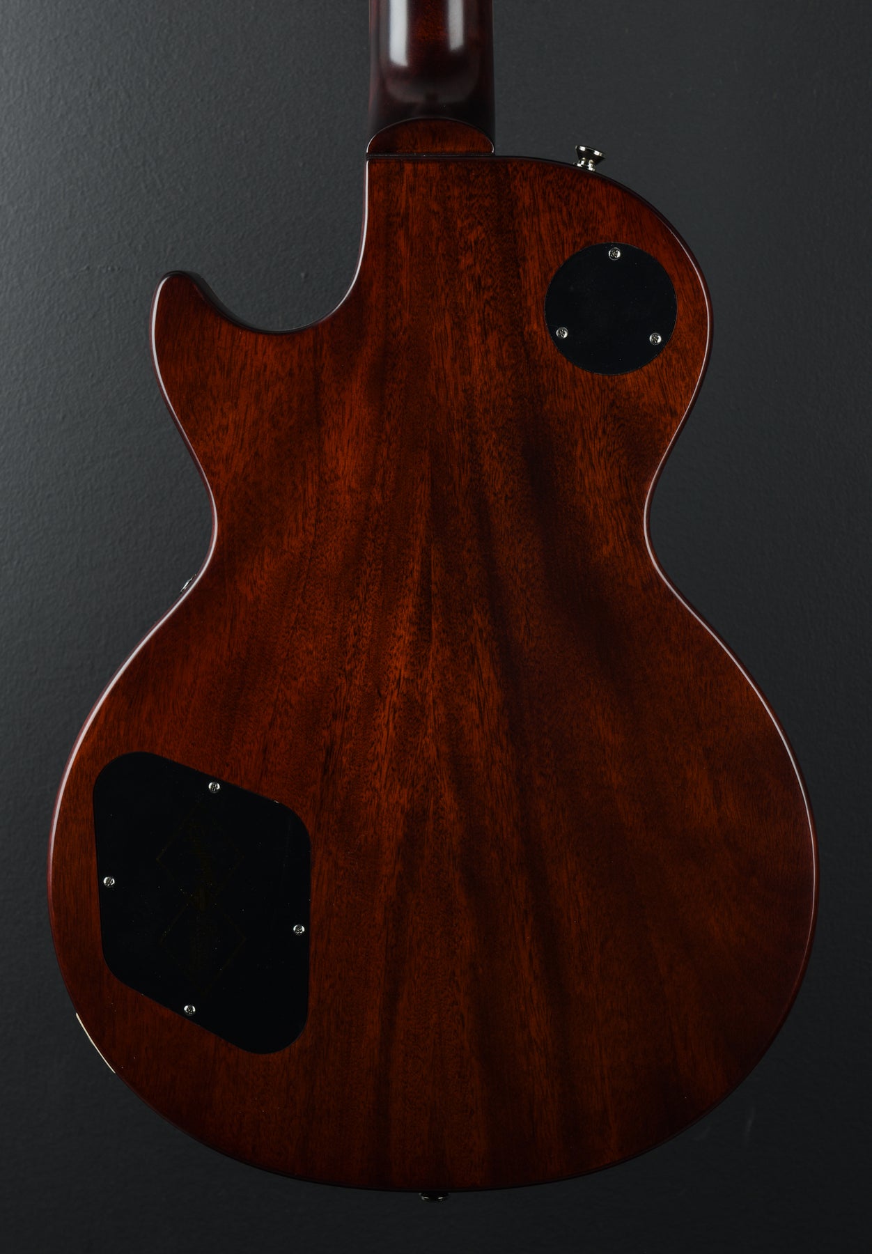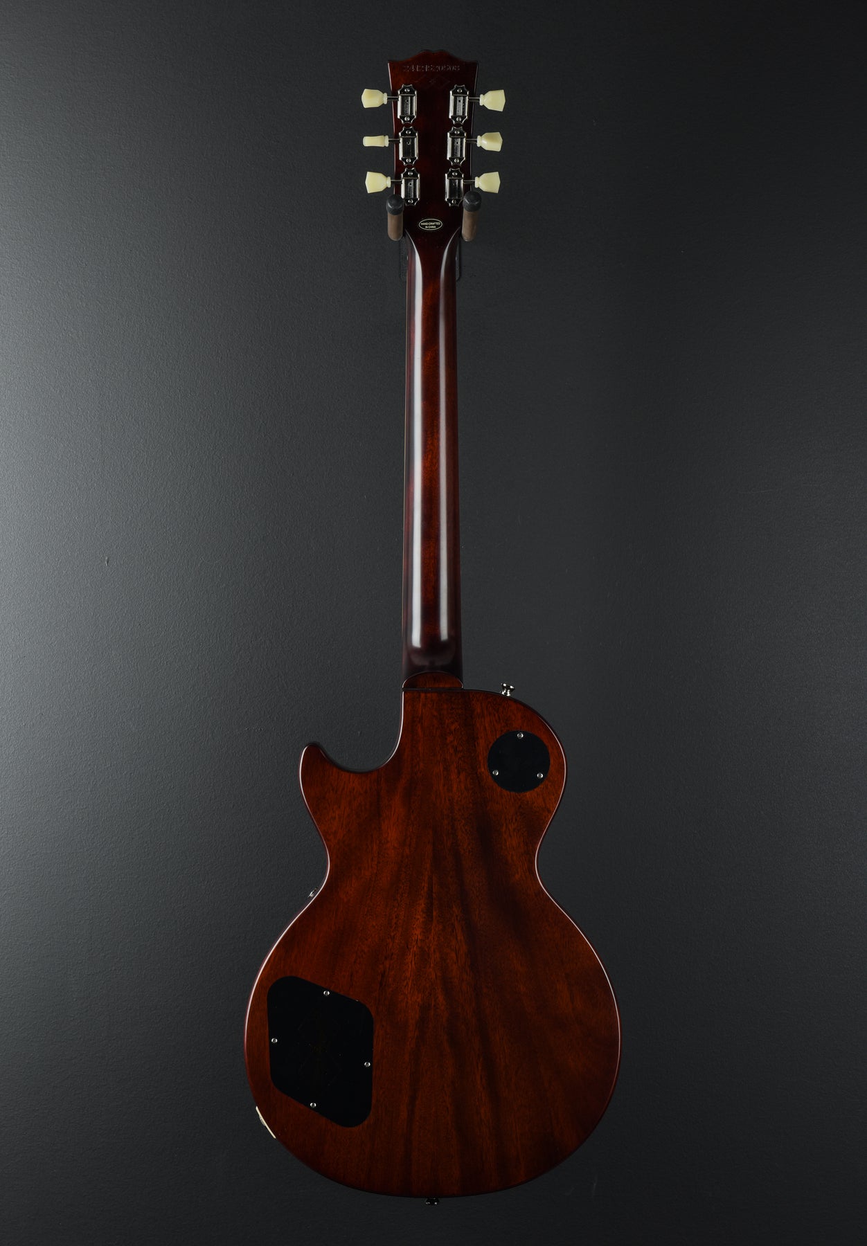 Tobacco Burst, VOS (vintage original sheen) polyurethane finish, Maple top with a AAA Flame Maple veneer, Mahogany body, 1959 rounded medium C shaped Mahogany neck, Bound 12” radius Indian Laurel fingerboard with the mother of pearl trapezoid inlays and medium jumbo frets, 24.75” scale length, 1.692″ nut width, Gibson Custombucker bridge and neck pickups, 3-way toggle switching with the volume and tone controls for each pickup, ABR-1 tune-o-matic bridge and Gibson historic reissue stop bar tailpiece, Epiphone deluxe tuners with the keystone buttons, 8.9 pounds, With the vintage style hardshell case