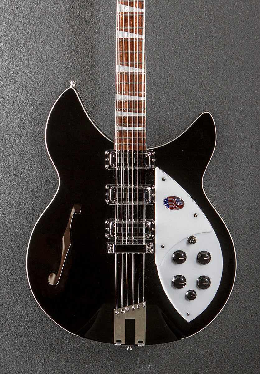 Jetglo, 15" wide semi-hollow Maple body, Set-in Maple/Walnut neck with a bound 10" radius Rosewood fingerboard and the pearlescent triangle inlays, 24.75″ scale length, 1 3/4″ nut width, Rickenbacker vintage single coil Toaster Top pickups, 3-way toggle switching with the two volume and two tone controls plus the bass blend control, Rick-o-Sound and mono output jacks, Six saddle adjustable bridge and trapeze tailpiece, Ric deluxe tuners, With hardshell case