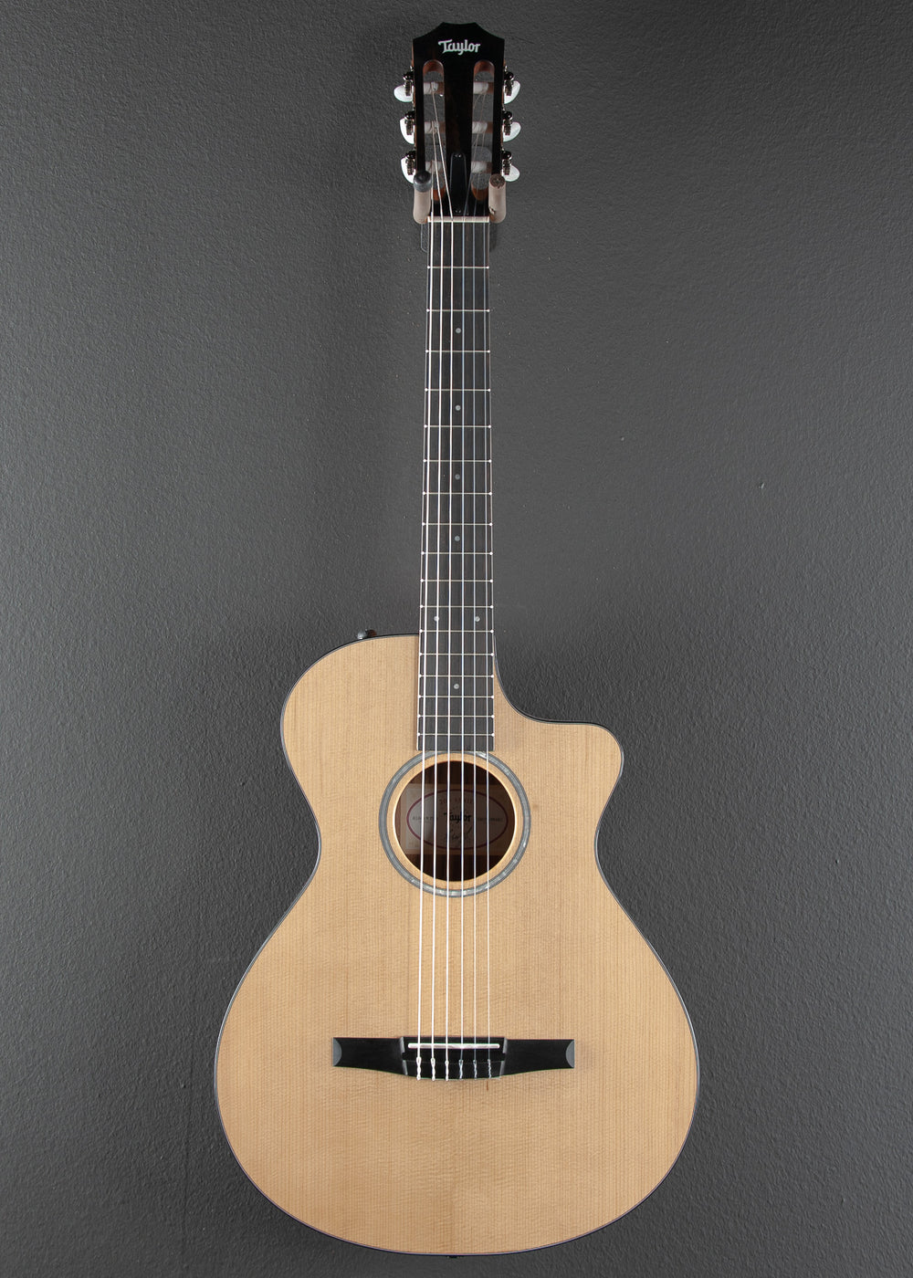 Natural, Gloss top and body finish, Grand Concert body shape with the venetian cutaway, Torrefied Spruce top, Single Ring Faux Pearl Rosette, Nylon series bracing, Layered Indian Rosewood back and sides, Black binding, West African Crelicam Ebony fingerboard with the faux pearl 4mm dot inlays on a Neo-Tropical Mahogany neck, 25.5" scale length, 1 7/8th" nut width, Strip tuners, The neck thickness is .83″ at the first and .85″ at the 9th frets, With the ES-N pickup system and Aerocase hard bag, Excellent