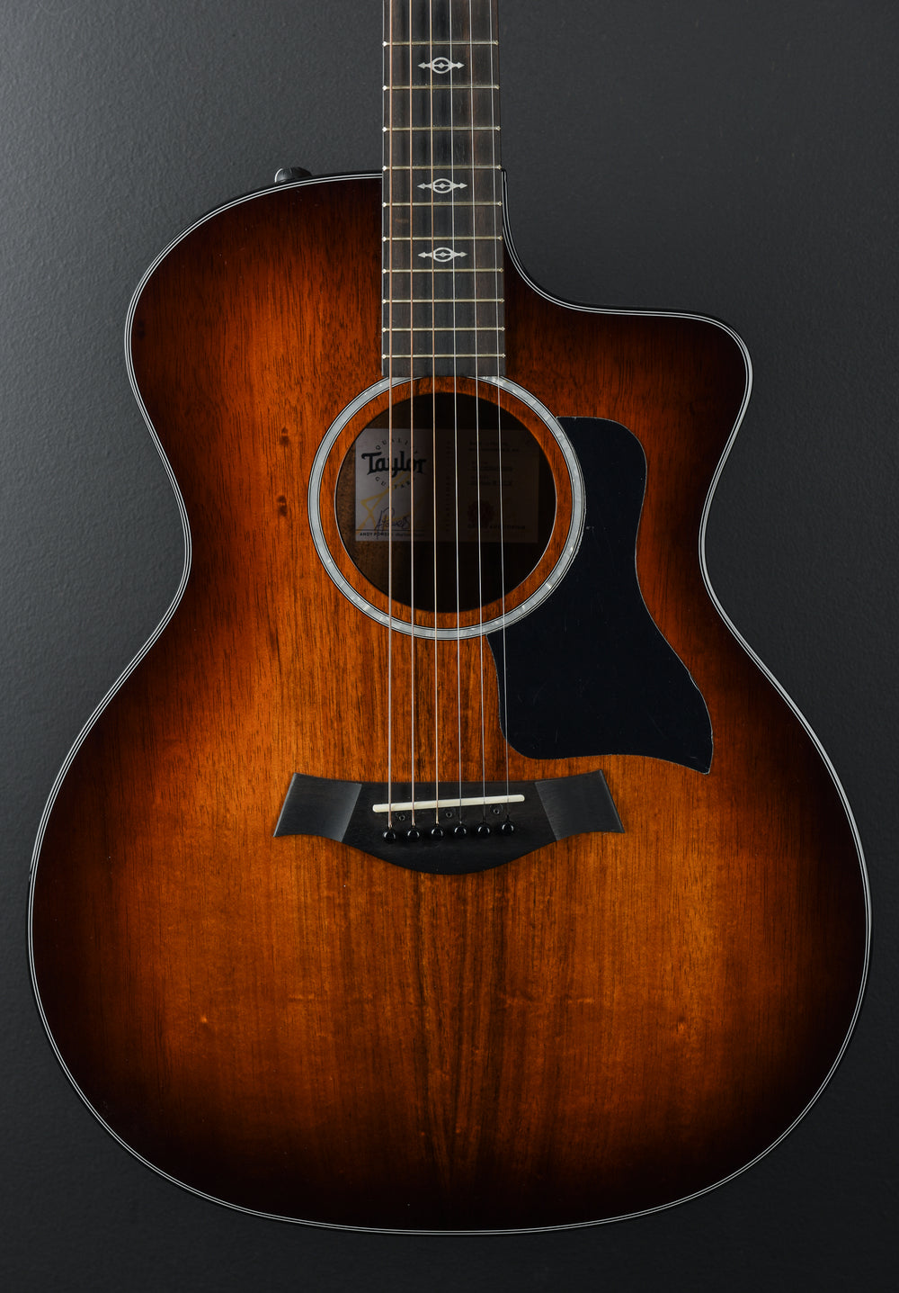 Very Good Condition, Shaded Edge Burst Finish, Grand Auditorium Body Shape With Venetian Cutaway, Solid Hawaiian Koa Top With Single-Ring Faux Pearl Rosette and C-Class Bracing With Relief Rout, Layered Hawaiian Koa Back and Sides With Black Binding, Tropical Mahogany Neck With West African Crelicam Ebony Fingerboard, 25.5″ Scale Length, 1 11/16″ Nut Width, Taylor Expression System 2 Electronics, Cast/Sealed Tuners, Gloss Top and Body Finish, Comes With the Original Hardshell Case.