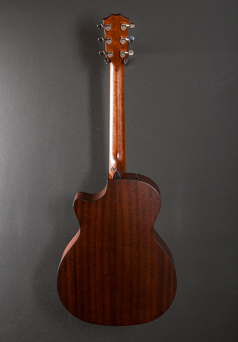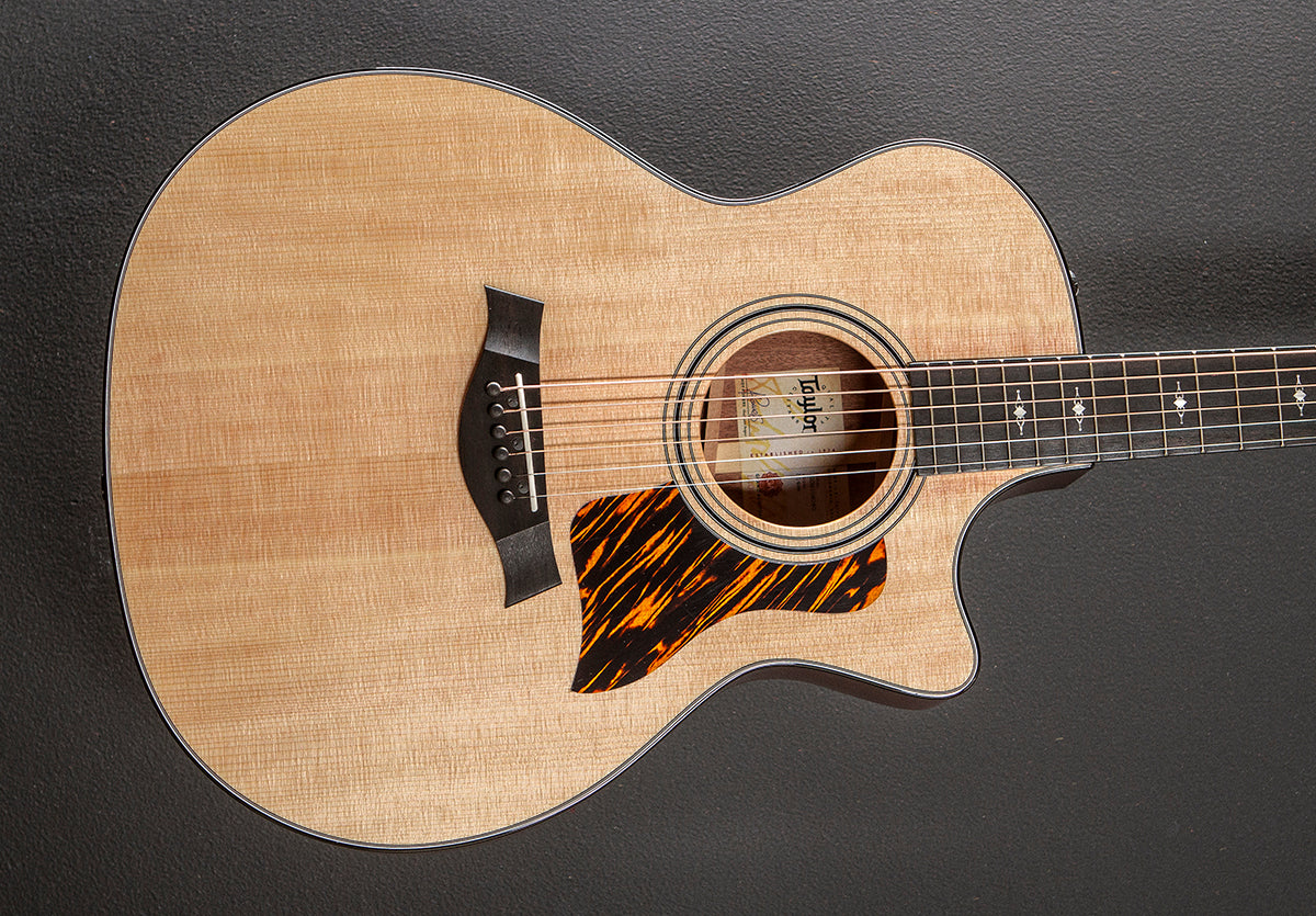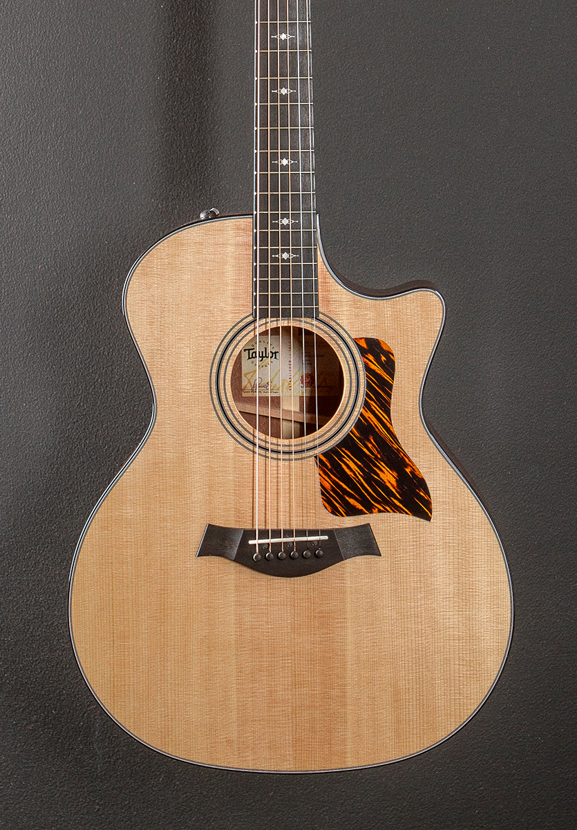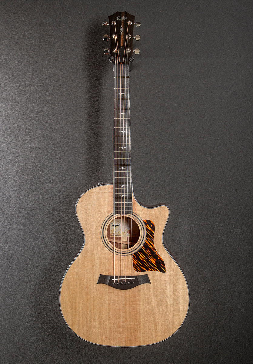 Natural, Gloss top and matte body/neck finish, Grand Auditorium body shape with the venetian cutaway, Sitka Spruce top, Three Ring Plastic Rosette, V-Class bracing with Relief Rout, Sapele back and sides, Black binding, West African Crelicam Ebony fingerboard with the Italian Acrylic Gemstone inlays on a Tropical Mahogany neck, 25.5” scale length, 1 3/4” nut width, Cast/sealed tuners, The neck thickness is .84″ at the first and .89″ at the 9th frets, With the Expression 2 pickup system and Taylor hardshell case, Excellent