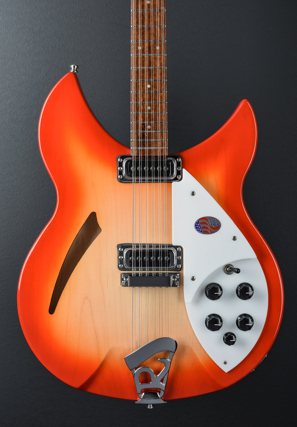 Fireglo, 15″ wide semi-hollow Maple body, Set-in Maple/Walnut neck, 10" radius Rosewood fingerboard with the pearloid dot inlays, 24.75″ scale length, 1.63″ nut width, Rickenbacker Hi-Gain bridge and neck pickups, 3-way toggle switching with the volume and tone controls for each pickup plus the bass blend control, Mono output jack, Six saddle adjustable bridge and "R" tailpiece, Gotoh tuners, 8.4 pounds, With hardshell case